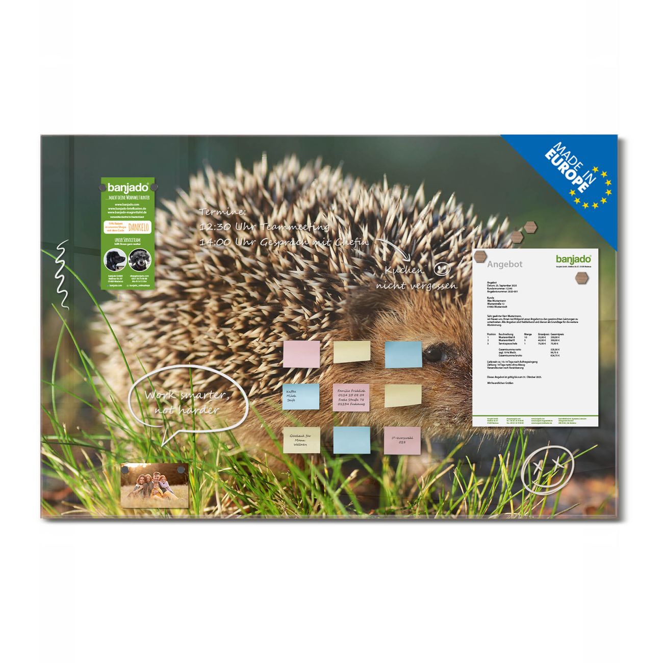 Jede Glas Magnettafel wird in unserer Werkstatt von Hand gefertigt und sorgfältig geprüft. So erhalten Sie ein echtes Qualitätsprodukt, das Funktion und Ästhetik perfekt vereint.?? Warum banjado?