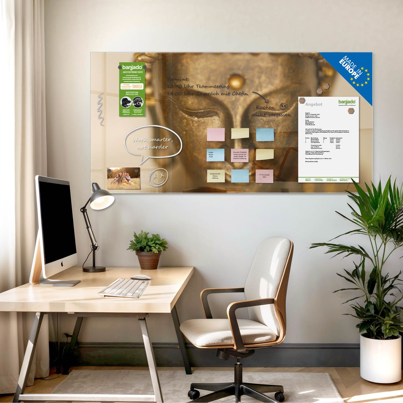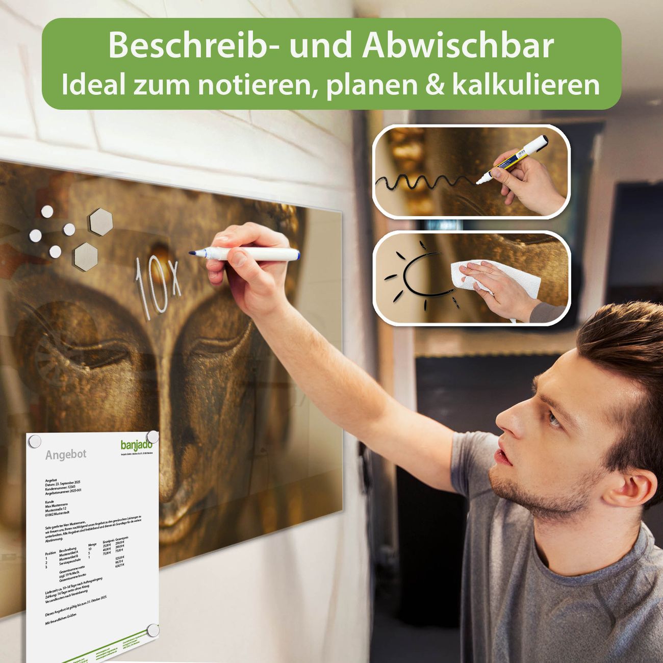 Jede Glas Magnettafel wird in unserer Werkstatt von Hand gefertigt und sorgfältig geprüft. So erhalten Sie ein echtes Qualitätsprodukt, das Funktion und Ästhetik perfekt vereint.?? Warum banjado?