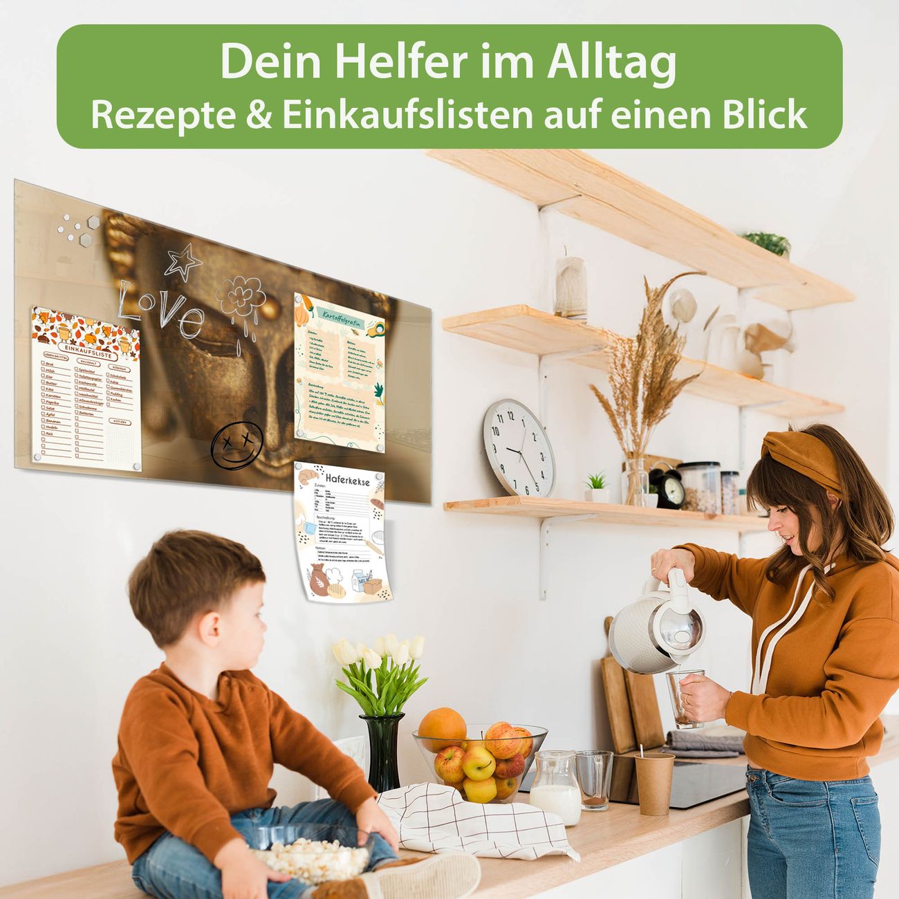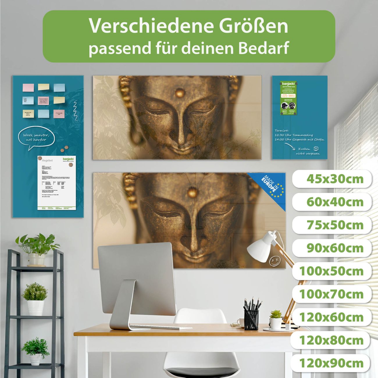 Ein Stück Design, das Ihren Alltag organisiert. Schreiben, heften, inspirieren - alles an einem Ort. Qualität, die man spürt. Montage leicht gemacht. Handwerk mit Herz - veredelt in Sachsen. Einzigartiges Design mit Motiv Motiv Buddha Gold Beschreibbare Glasoberfläche, leicht zu reinigen Starke Magnetkraft durch Stahlrückwand Inklusive 4 Neodym-Magneten Flexible Montageoptionen Handveredelt in Sachsen - Qualität, die bleibt