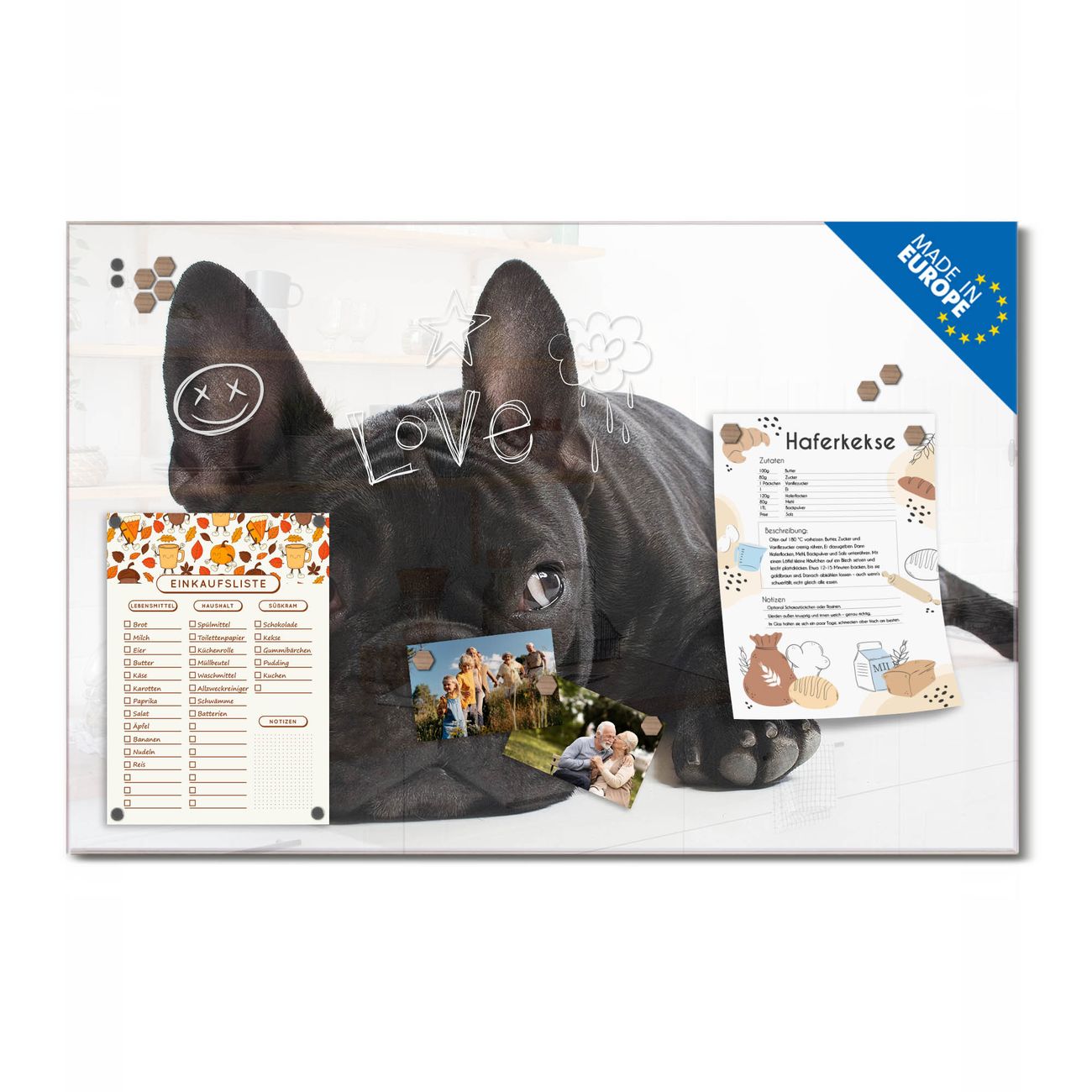 Ein Stück Design, das Ihren Alltag organisiert. Schreiben, heften, inspirieren - alles an einem Ort. Qualität, die man spürt. Montage leicht gemacht. Handwerk mit Herz - veredelt in Sachsen. Einzigartiges Design mit Motiv Motiv Bulldogge Beschreibbare Glasoberfläche, leicht zu reinigen Starke Magnetkraft durch Stahlrückwand Inklusive 4 Neodym-Magneten Flexible Montageoptionen Handveredelt in Sachsen - Qualität, die bleibt