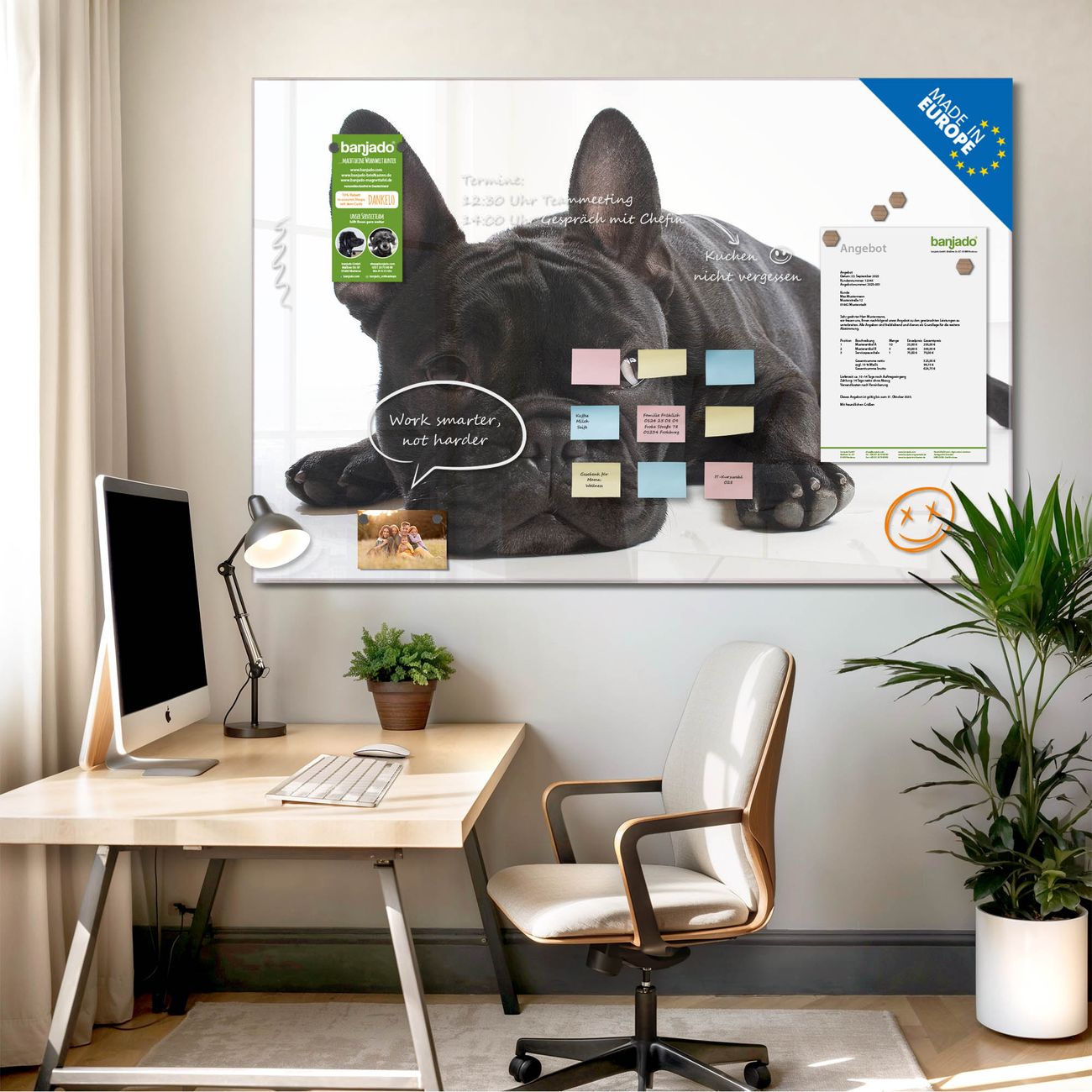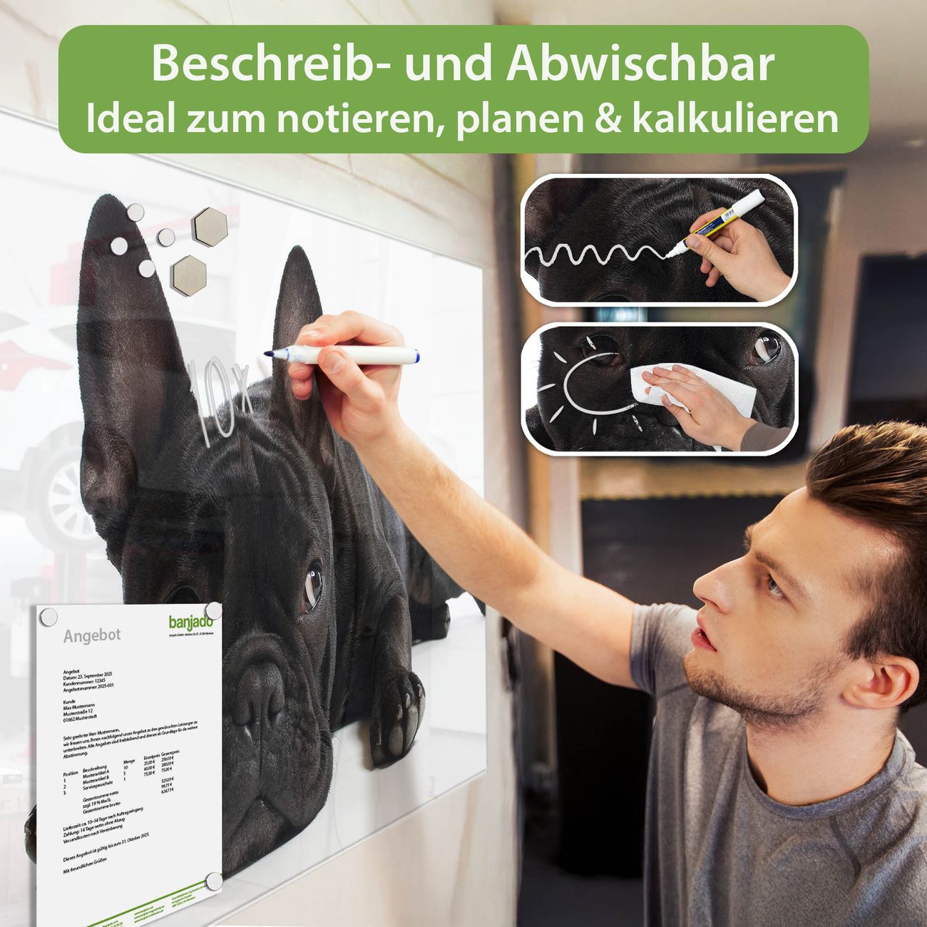 Jede Glas Magnettafel wird in unserer Werkstatt von Hand gefertigt und sorgfältig geprüft. So erhalten Sie ein echtes Qualitätsprodukt, das Funktion und Ästhetik perfekt vereint.?? Warum banjado?