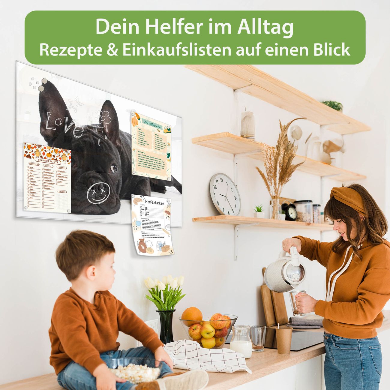 Auf der glatten Glasoberfläche lassen sich Termine, Rezepte oder Notizen ganz einfach mit Kreidestiften festhalten und rückstandslos entfernen. Starke Neodym-Magnete halten Ihre wichtigsten Erinnerungen sicher an Ort und Stelle. So entsteht Ihre ganz persönliche Ideenwand - jeden Tag neu.