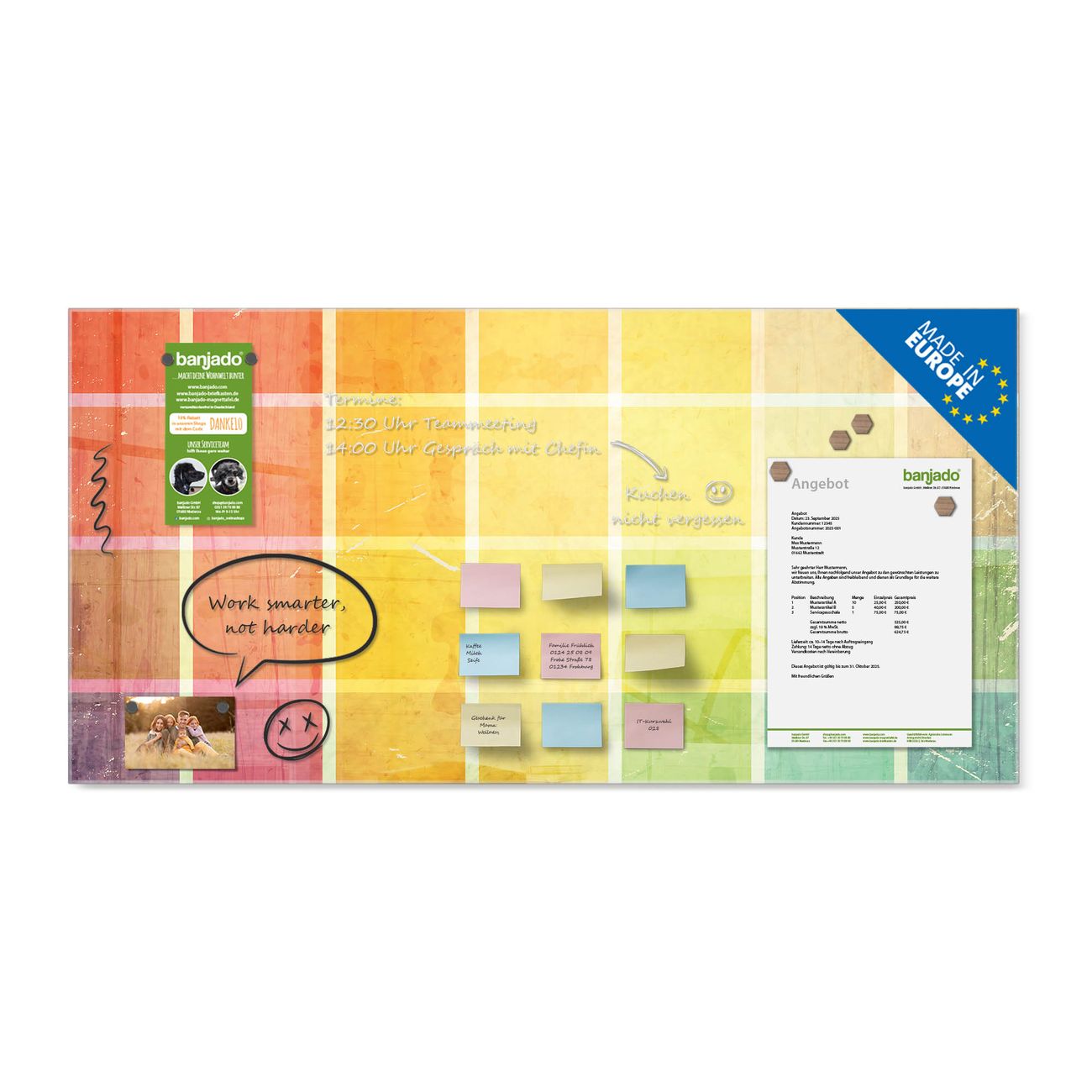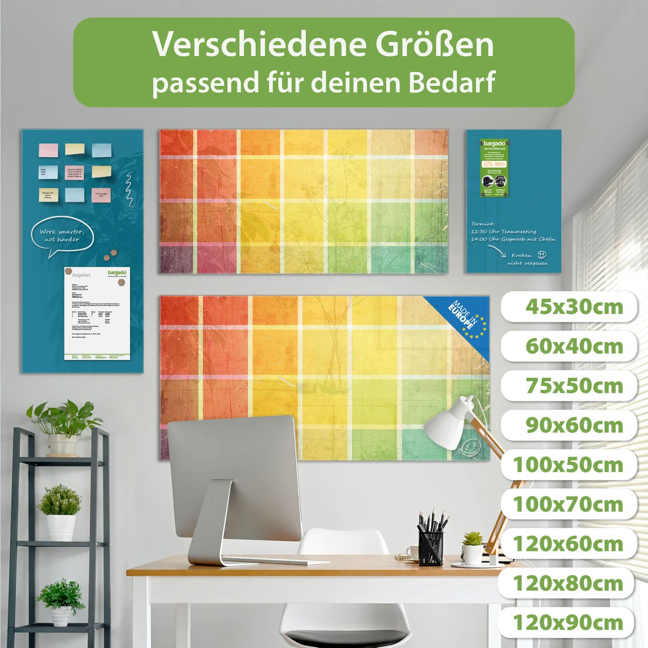 Jede Glas Magnettafel wird in unserer Werkstatt von Hand gefertigt und sorgfältig geprüft. So erhalten Sie ein echtes Qualitätsprodukt, das Funktion und Ästhetik perfekt vereint.?? Warum banjado?