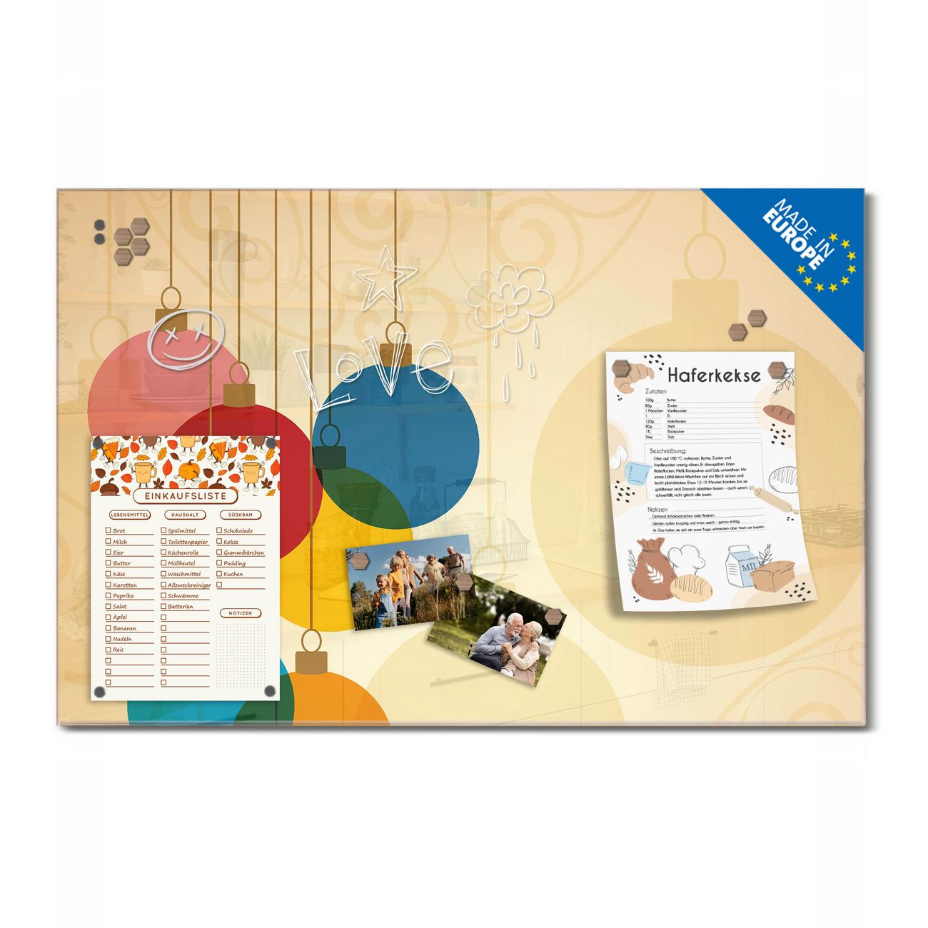 Ein Stück Design, das Ihren Alltag organisiert. Schreiben, heften, inspirieren - alles an einem Ort. Qualität, die man spürt. Montage leicht gemacht. Handwerk mit Herz - veredelt in Sachsen. Einzigartiges Design mit Motiv Motiv Bunte Kugeln Beschreibbare Glasoberfläche, leicht zu reinigen Starke Magnetkraft durch Stahlrückwand Inklusive 4 Neodym-Magneten Flexible Montageoptionen Handveredelt in Sachsen - Qualität, die bleibt