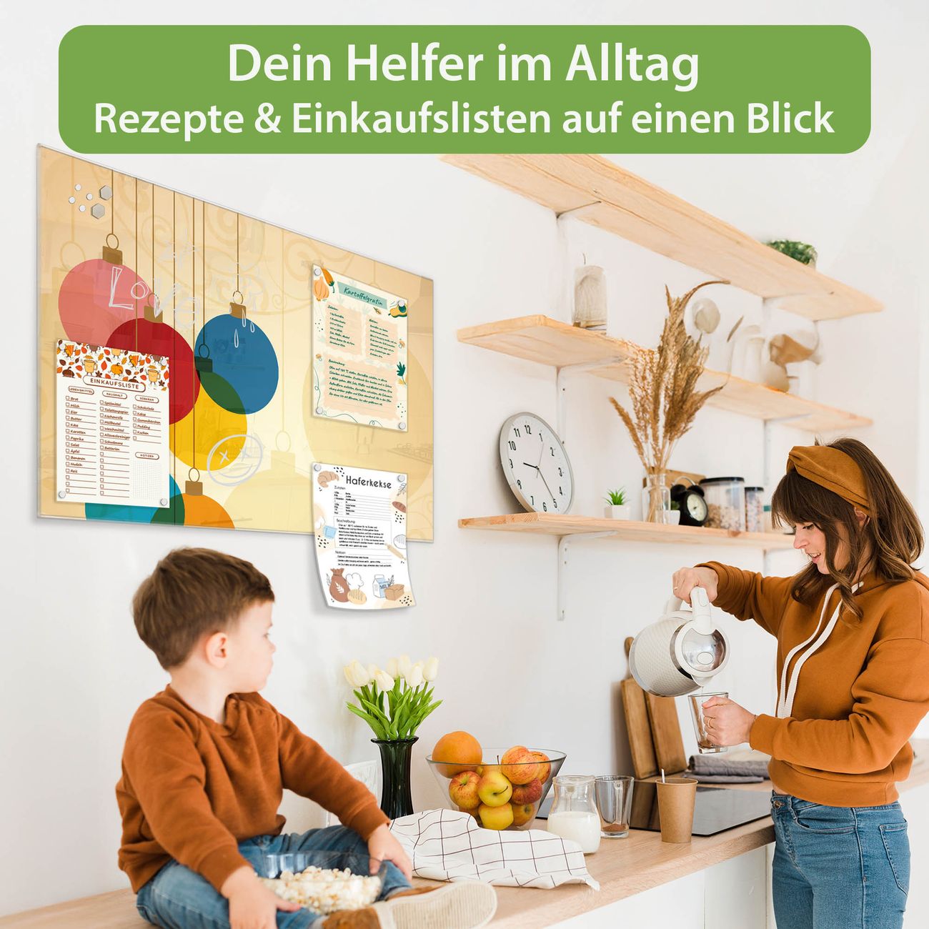 Auf der glatten Glasoberfläche lassen sich Termine, Rezepte oder Notizen ganz einfach mit Kreidestiften festhalten und rückstandslos entfernen. Starke Neodym-Magnete halten Ihre wichtigsten Erinnerungen sicher an Ort und Stelle. So entsteht Ihre ganz persönliche Ideenwand - jeden Tag neu.