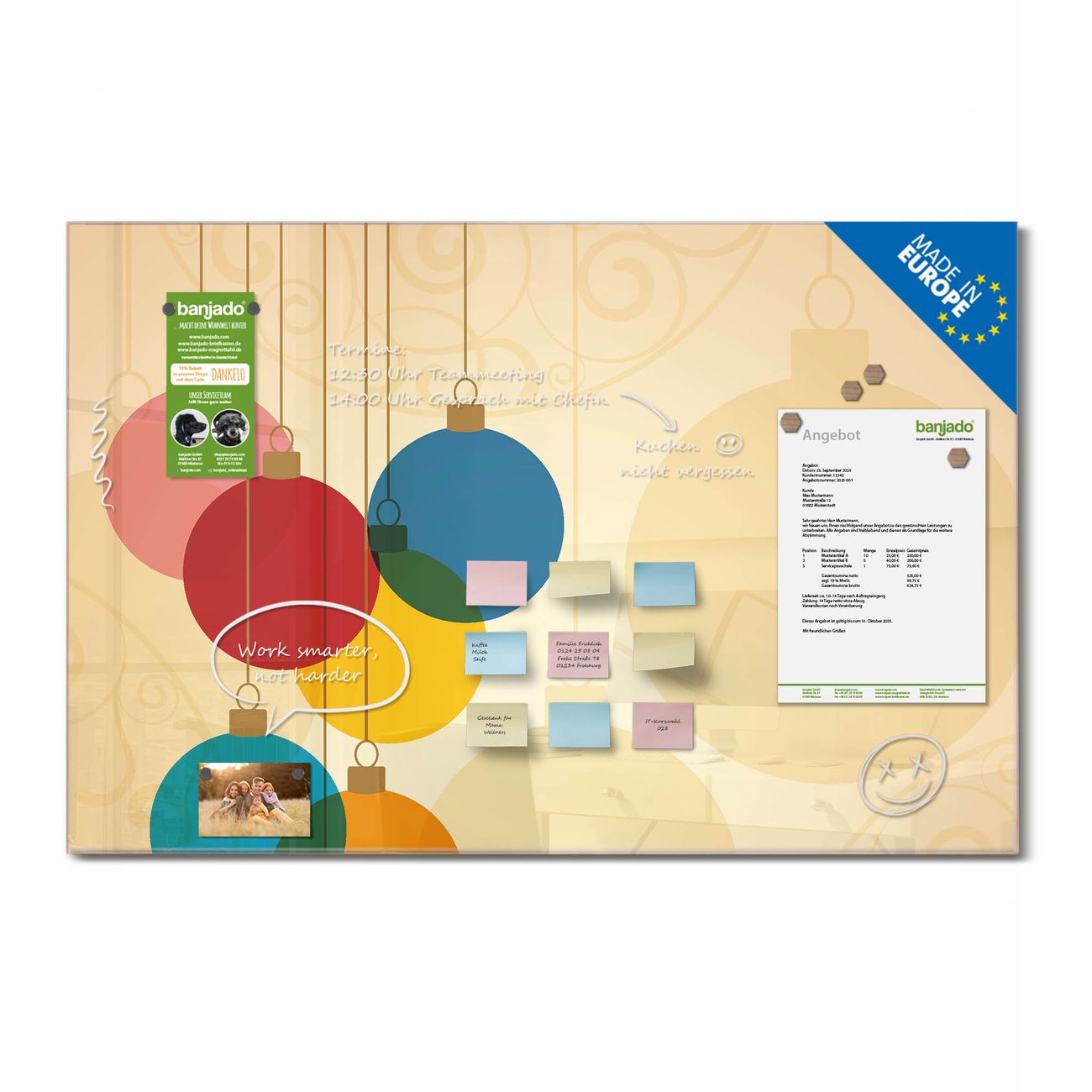 Jede Glas Magnettafel wird in unserer Werkstatt von Hand gefertigt und sorgfältig geprüft. So erhalten Sie ein echtes Qualitätsprodukt, das Funktion und Ästhetik perfekt vereint.?? Warum banjado?