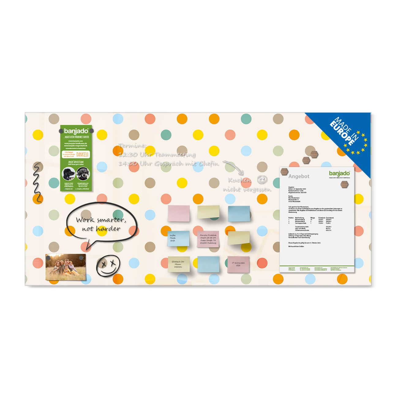 Ein Stück Design, das Ihren Alltag organisiert. Schreiben, heften, inspirieren - alles an einem Ort. Qualität, die man spürt. Montage leicht gemacht. Handwerk mit Herz - veredelt in Sachsen. Einzigartiges Design mit Motiv Motiv Bunte Punkte Beschreibbare Glasoberfläche, leicht zu reinigen Starke Magnetkraft durch Stahlrückwand Inklusive 4 Neodym-Magneten Flexible Montageoptionen Handveredelt in Sachsen - Qualität, die bleibt