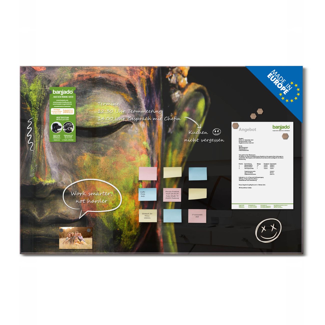 Ein Stück Design, das Ihren Alltag organisiert. Schreiben, heften, inspirieren - alles an einem Ort. Qualität, die man spürt. Montage leicht gemacht. Handwerk mit Herz - veredelt in Sachsen. Einzigartiges Design mit Motiv Motiv Bunter Buddha Beschreibbare Glasoberfläche, leicht zu reinigen Starke Magnetkraft durch Stahlrückwand Inklusive 4 Neodym-Magneten Flexible Montageoptionen Handveredelt in Sachsen - Qualität, die bleibt