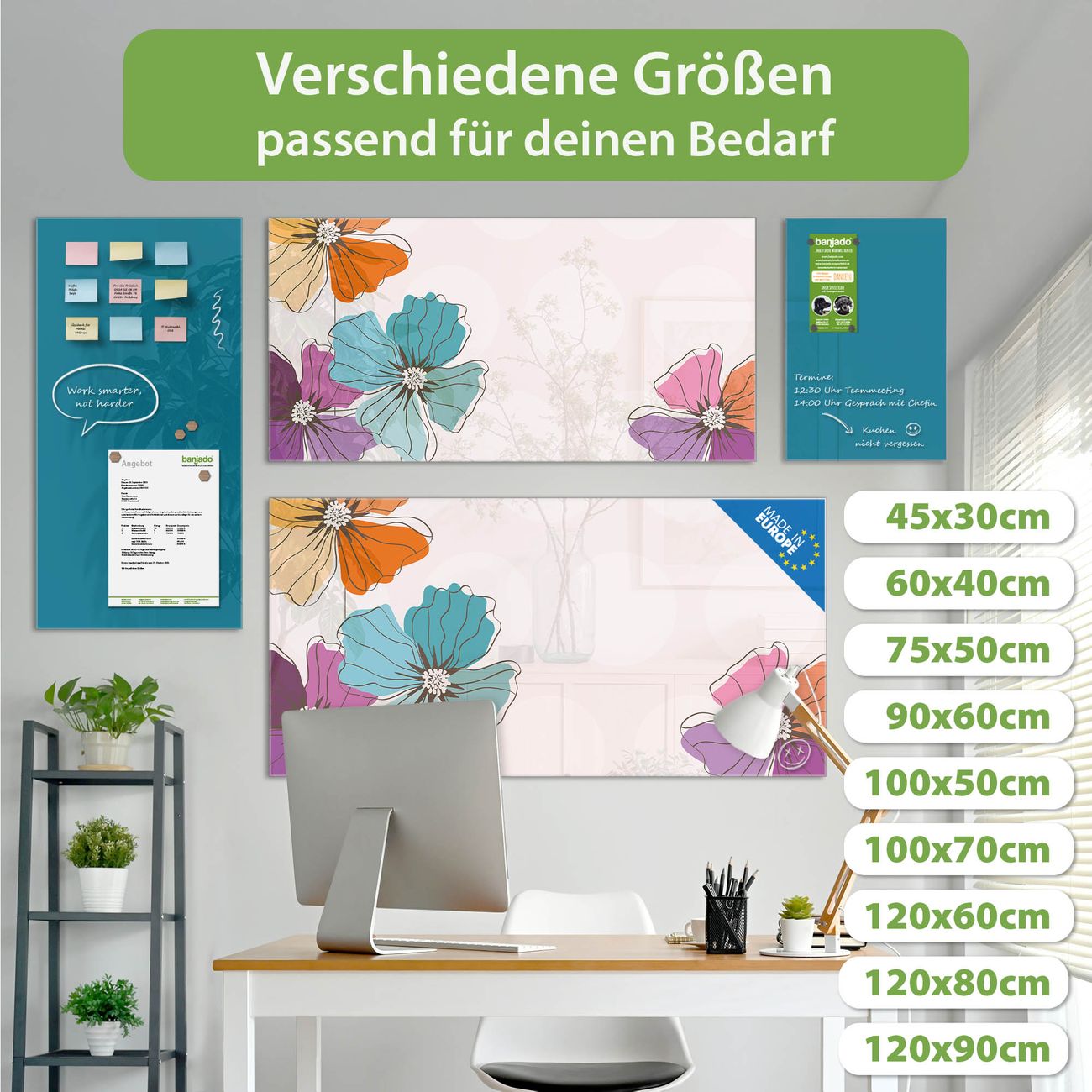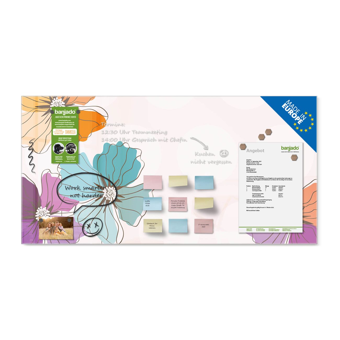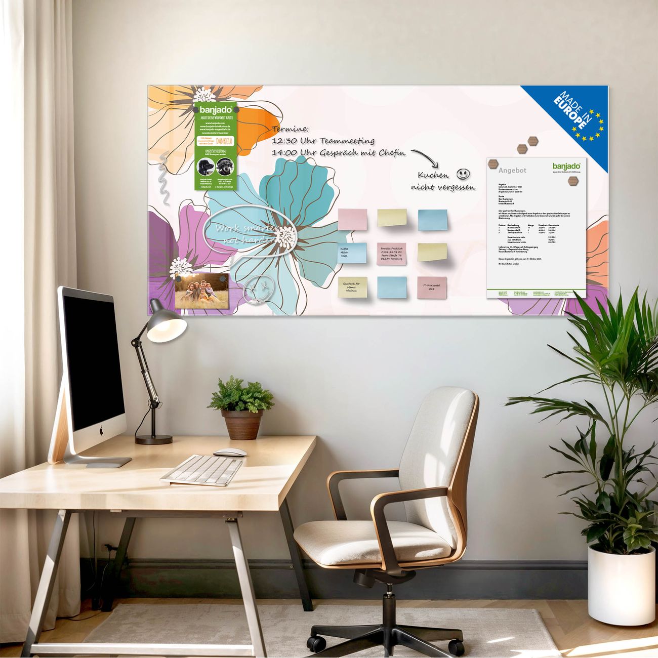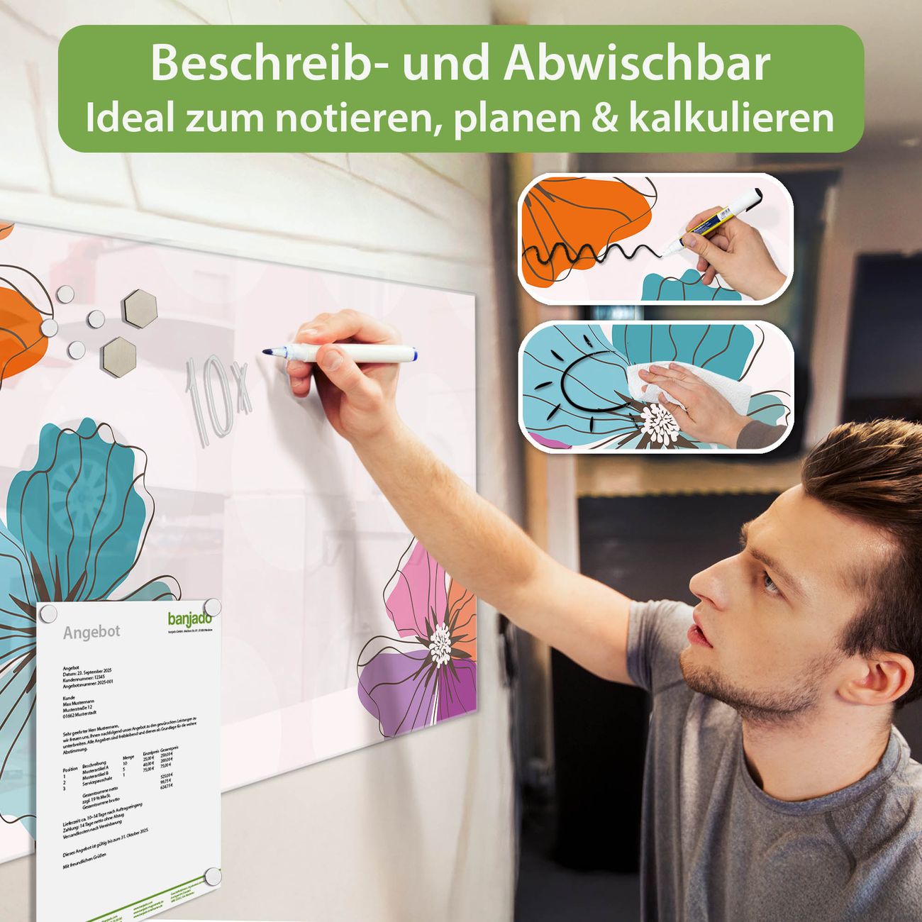 Jede Glas Magnettafel wird in unserer Werkstatt von Hand gefertigt und sorgfältig geprüft. So erhalten Sie ein echtes Qualitätsprodukt, das Funktion und Ästhetik perfekt vereint.?? Warum banjado?