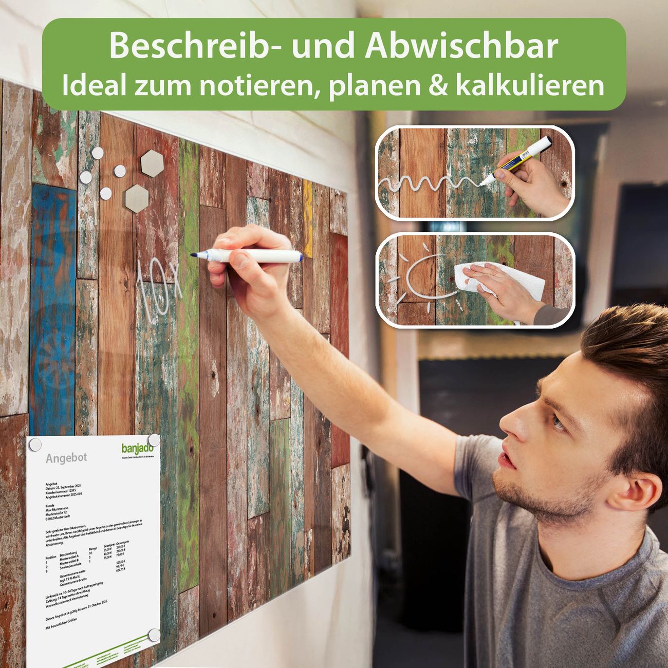 Jede Glas Magnettafel wird in unserer Werkstatt von Hand gefertigt und sorgfältig geprüft. So erhalten Sie ein echtes Qualitätsprodukt, das Funktion und Ästhetik perfekt vereint.?? Warum banjado?
