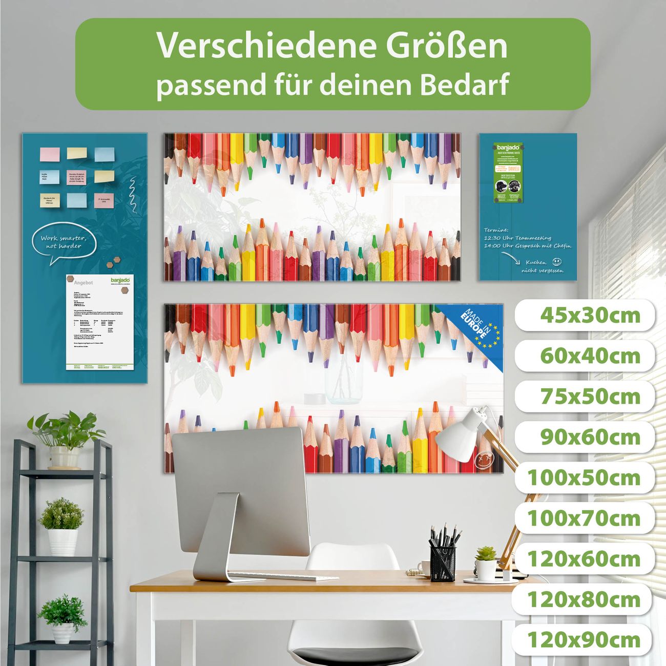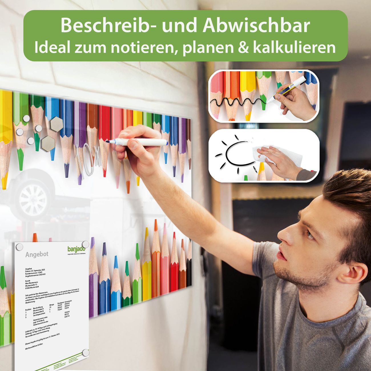 Jede Glas Magnettafel wird in unserer Werkstatt von Hand gefertigt und sorgfältig geprüft. So erhalten Sie ein echtes Qualitätsprodukt, das Funktion und Ästhetik perfekt vereint.?? Warum banjado?