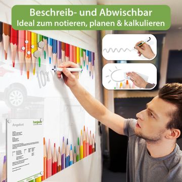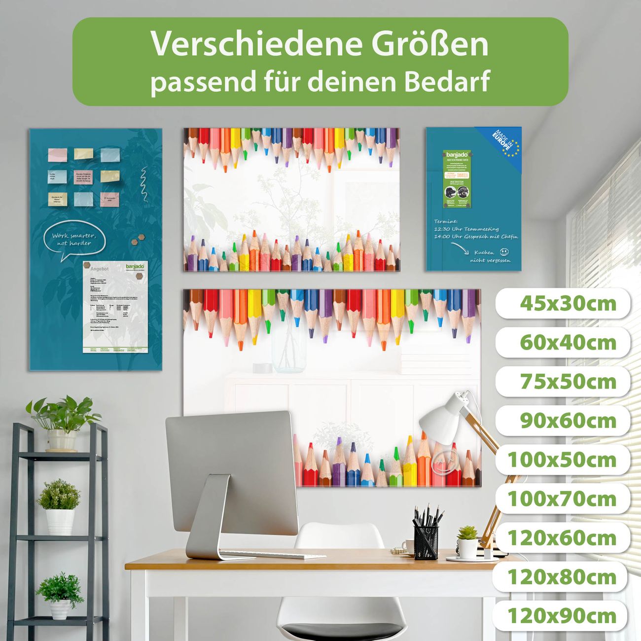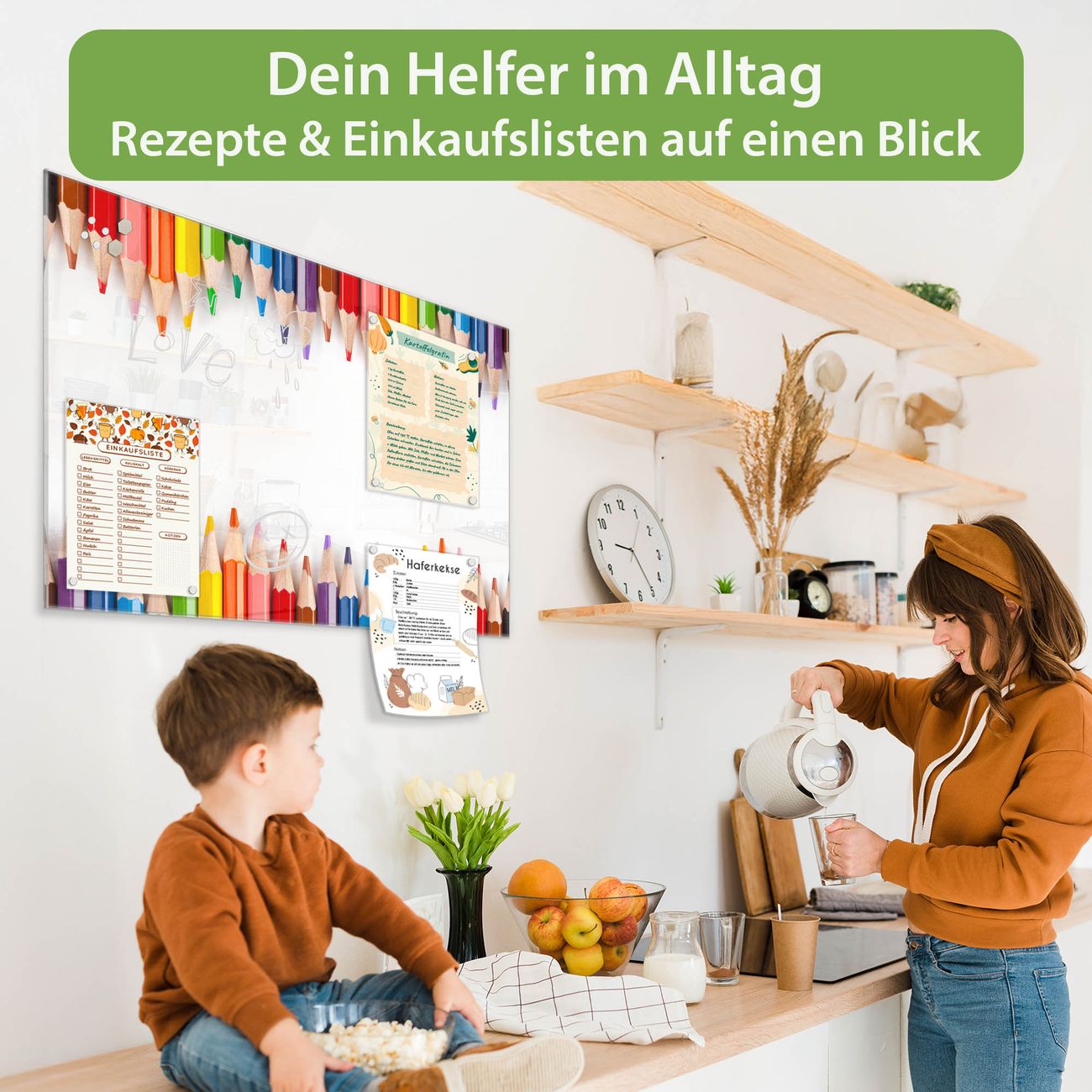 Ein Stück Design, das Ihren Alltag organisiert. Schreiben, heften, inspirieren - alles an einem Ort. Qualität, die man spürt. Montage leicht gemacht. Handwerk mit Herz - veredelt in Sachsen. Einzigartiges Design mit Motiv Motiv Buntstifte Beschreibbare Glasoberfläche, leicht zu reinigen Starke Magnetkraft durch Stahlrückwand Inklusive 4 Neodym-Magneten Flexible Montageoptionen Handveredelt in Sachsen - Qualität, die bleibt