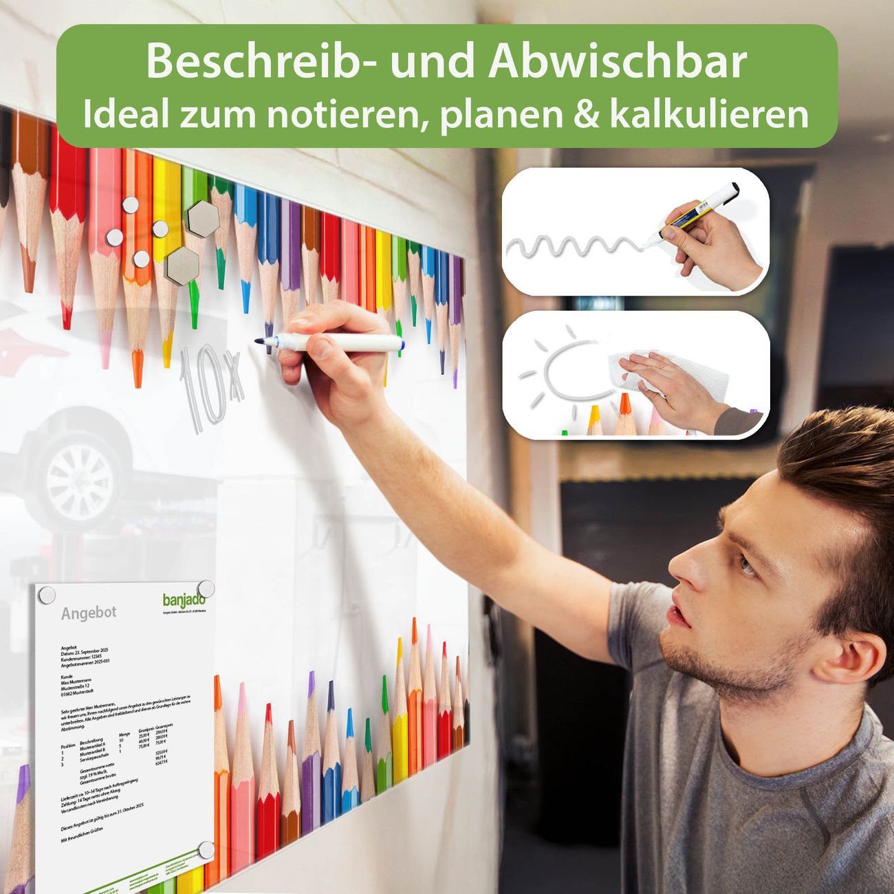 Jede Glas Magnettafel wird in unserer Werkstatt von Hand gefertigt und sorgfältig geprüft. So erhalten Sie ein echtes Qualitätsprodukt, das Funktion und Ästhetik perfekt vereint.?? Warum banjado?