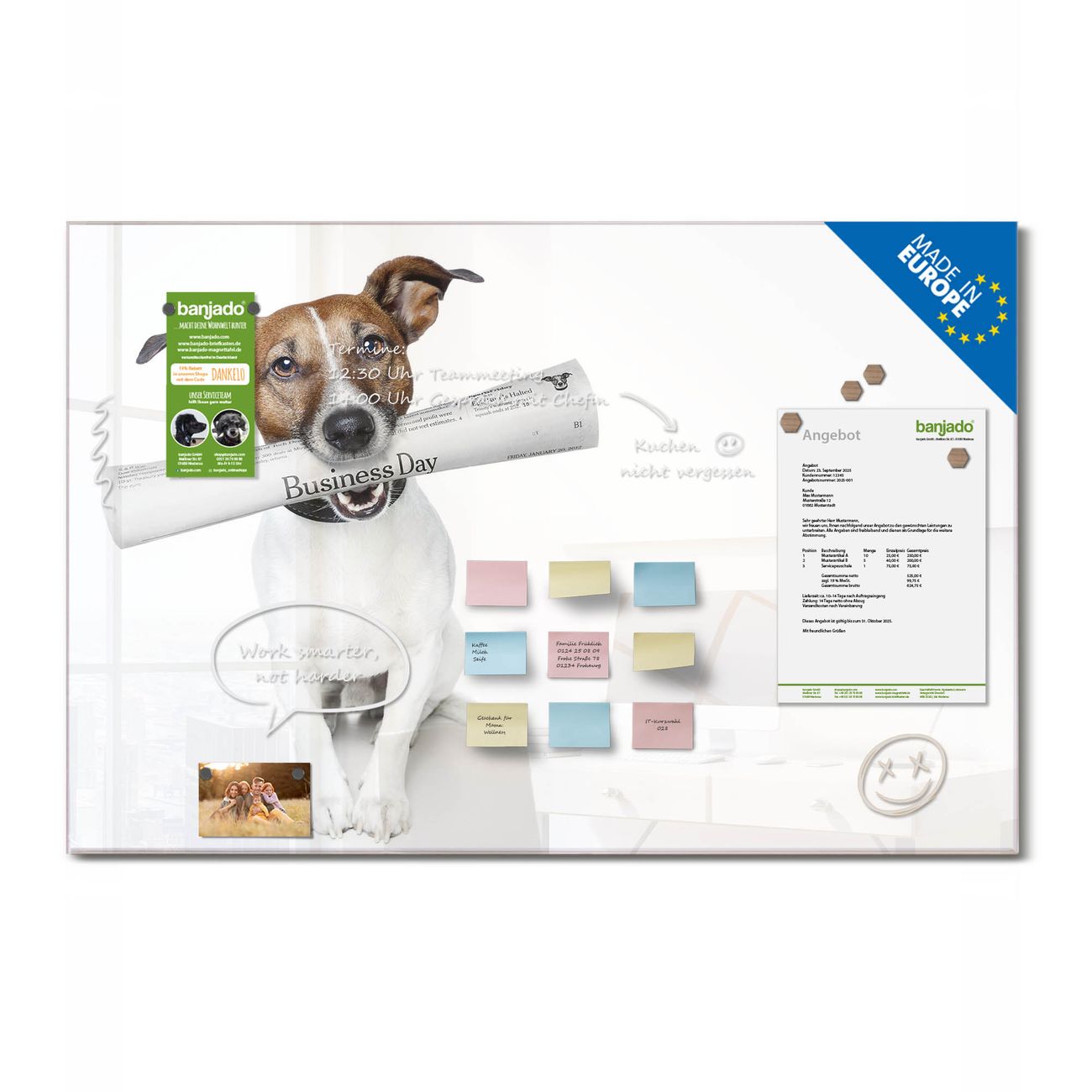 Jede Glas Magnettafel wird in unserer Werkstatt von Hand gefertigt und sorgfältig geprüft. So erhalten Sie ein echtes Qualitätsprodukt, das Funktion und Ästhetik perfekt vereint.?? Warum banjado?