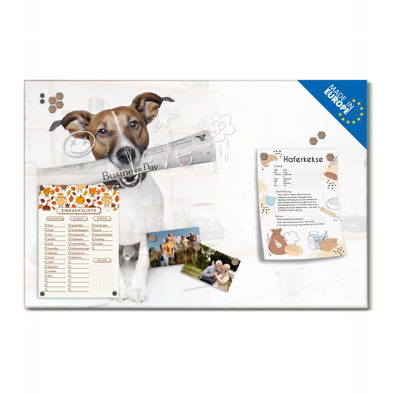 Ein Stück Design, das Ihren Alltag organisiert. Schreiben, heften, inspirieren - alles an einem Ort. Qualität, die man spürt. Montage leicht gemacht. Handwerk mit Herz - veredelt in Sachsen. Einzigartiges Design mit Motiv Motiv Business Day Beschreibbare Glasoberfläche, leicht zu reinigen Starke Magnetkraft durch Stahlrückwand Inklusive 4 Neodym-Magneten Flexible Montageoptionen Handveredelt in Sachsen - Qualität, die bleibt