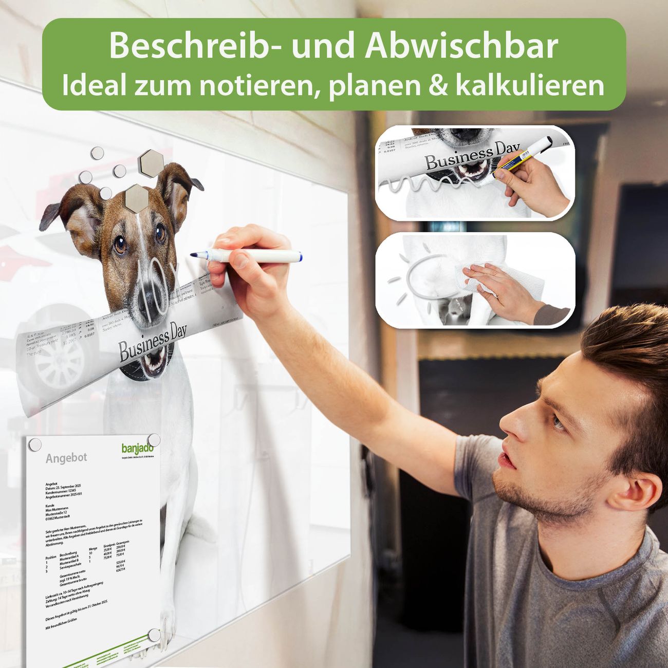 Jede Glas Magnettafel wird in unserer Werkstatt von Hand gefertigt und sorgfältig geprüft. So erhalten Sie ein echtes Qualitätsprodukt, das Funktion und Ästhetik perfekt vereint.?? Warum banjado?