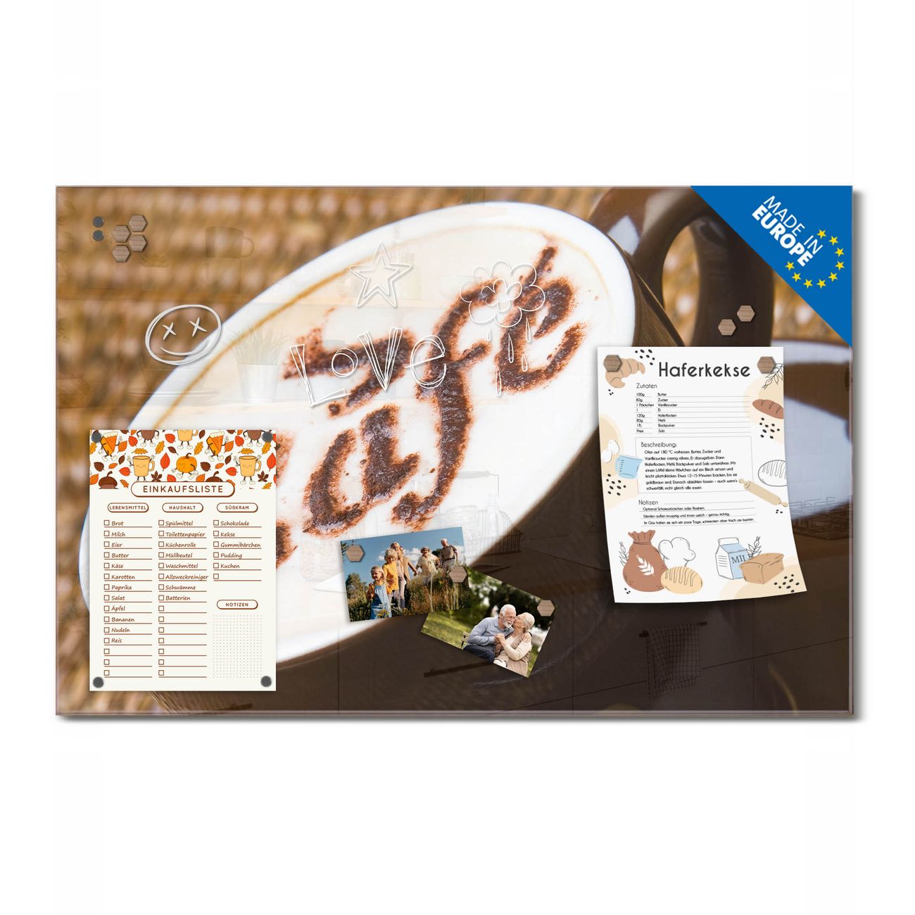 Ein Stück Design, das Ihren Alltag organisiert. Schreiben, heften, inspirieren - alles an einem Ort. Qualität, die man spürt. Montage leicht gemacht. Handwerk mit Herz - veredelt in Sachsen. Einzigartiges Design mit Motiv Motiv Cafe Beschreibbare Glasoberfläche, leicht zu reinigen Starke Magnetkraft durch Stahlrückwand Inklusive 4 Neodym-Magneten Flexible Montageoptionen Handveredelt in Sachsen - Qualität, die bleibt