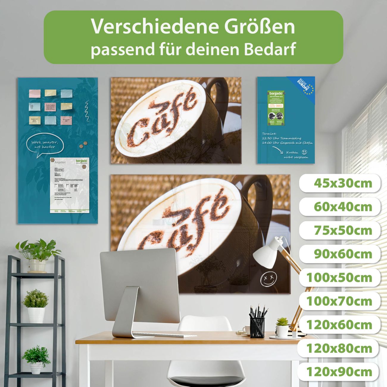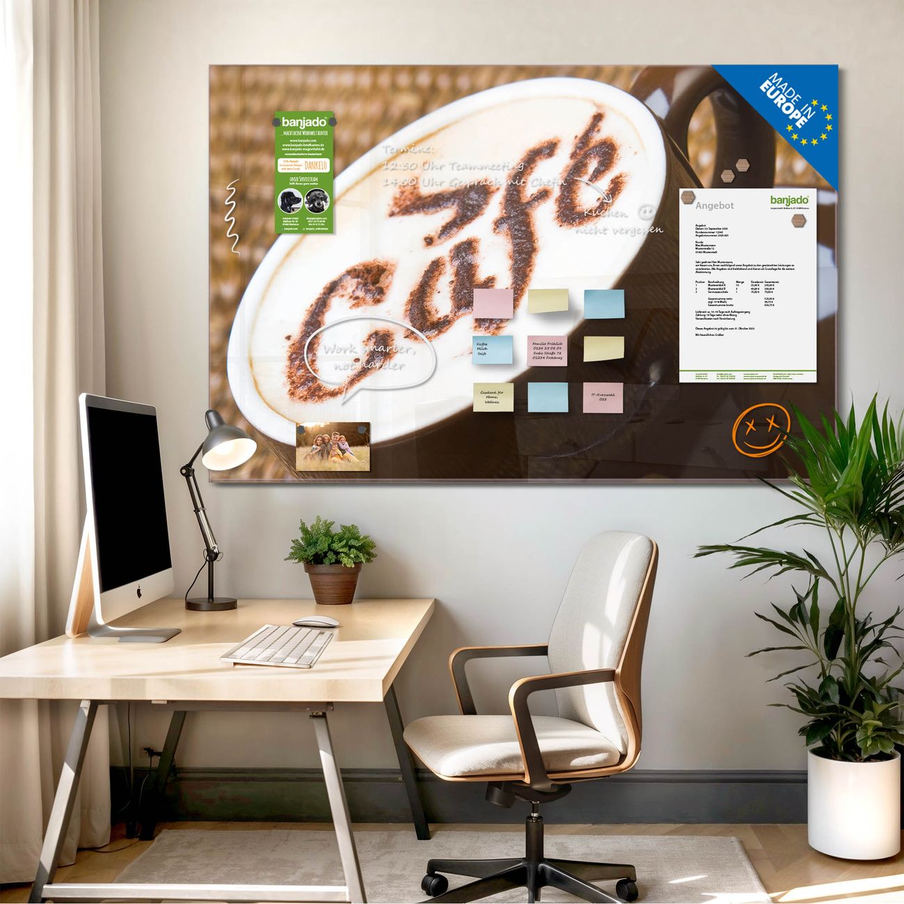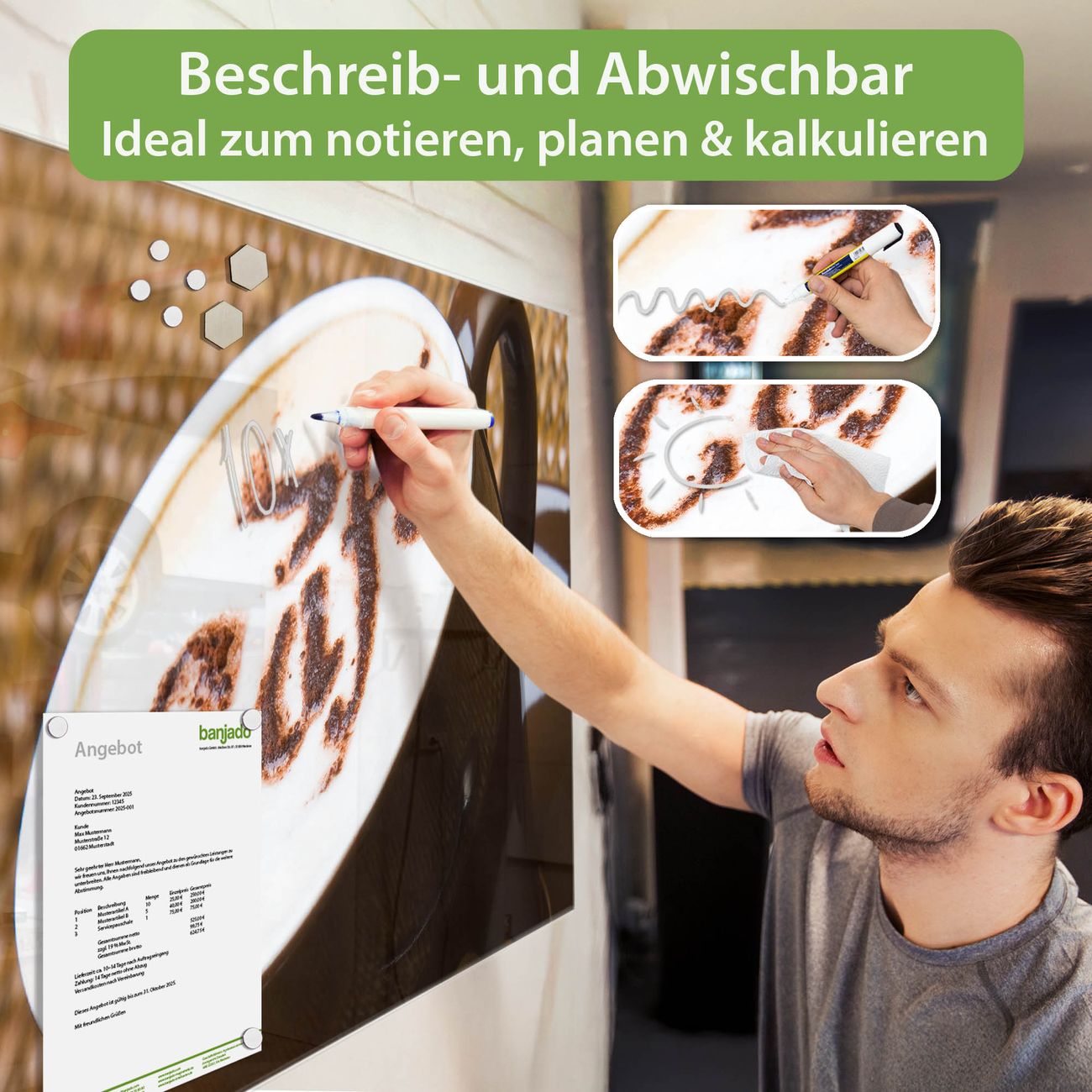 Jede Glas Magnettafel wird in unserer Werkstatt von Hand gefertigt und sorgfältig geprüft. So erhalten Sie ein echtes Qualitätsprodukt, das Funktion und Ästhetik perfekt vereint.?? Warum banjado?