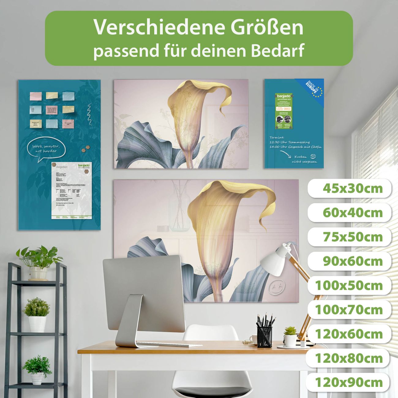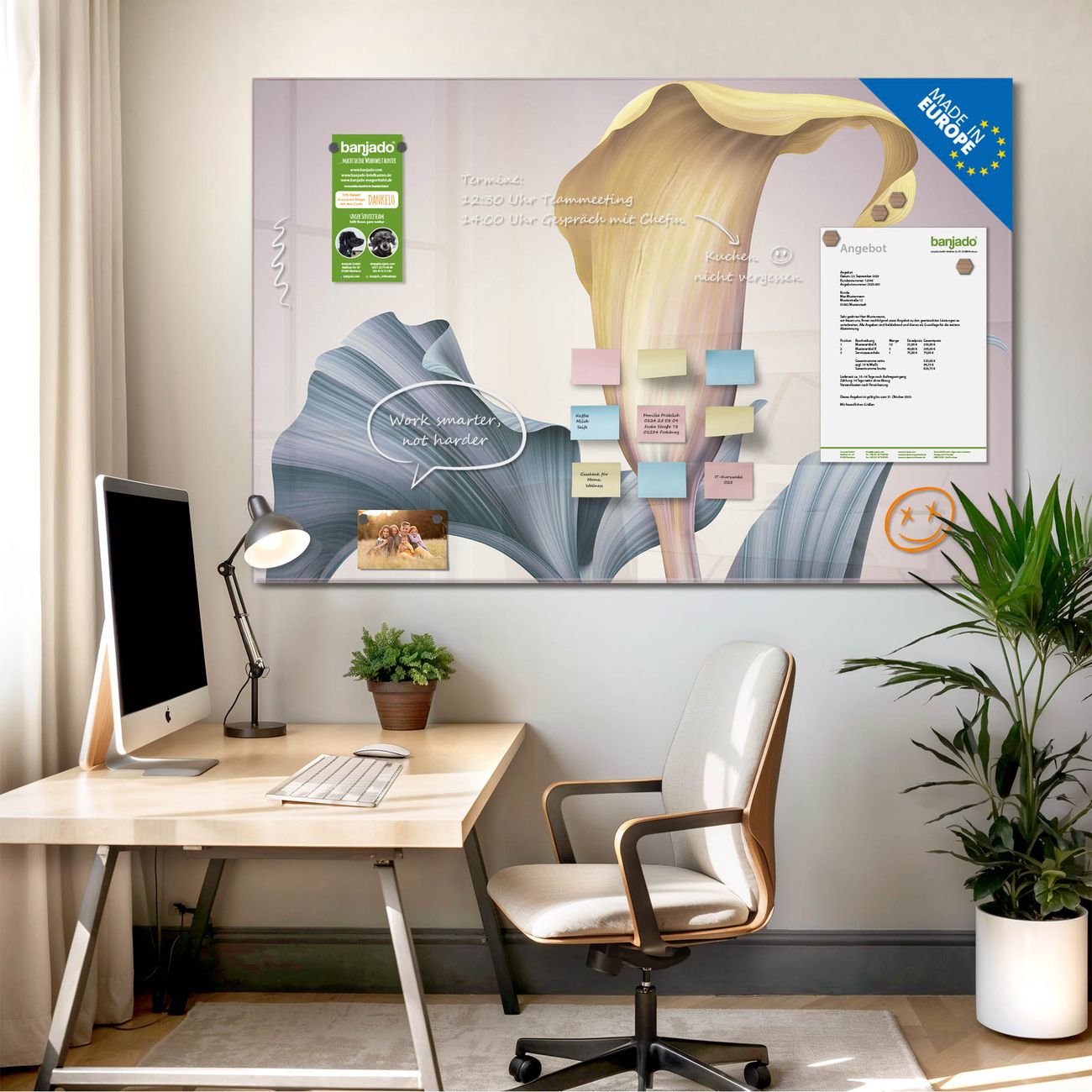 Die banjado Glas Magnettafel mit dem Motiv Motiv Calla verbindet Funktionalität mit Stil. Sie ersetzt das Zettelchaos durch klare Strukturen und bringt dabei eine warme, natürliche Atmosphäre in Ihr Zuhause. Ob im Büro, in der Küche oder im Eingangsbereich - dieses Design-Board zieht Blicke an und sorgt für Ordnung mit Charakter.
