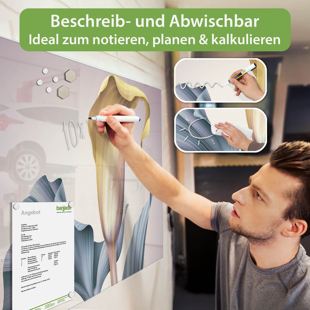 Jede Glas Magnettafel wird in unserer Werkstatt von Hand gefertigt und sorgfältig geprüft. So erhalten Sie ein echtes Qualitätsprodukt, das Funktion und Ästhetik perfekt vereint.?? Warum banjado?