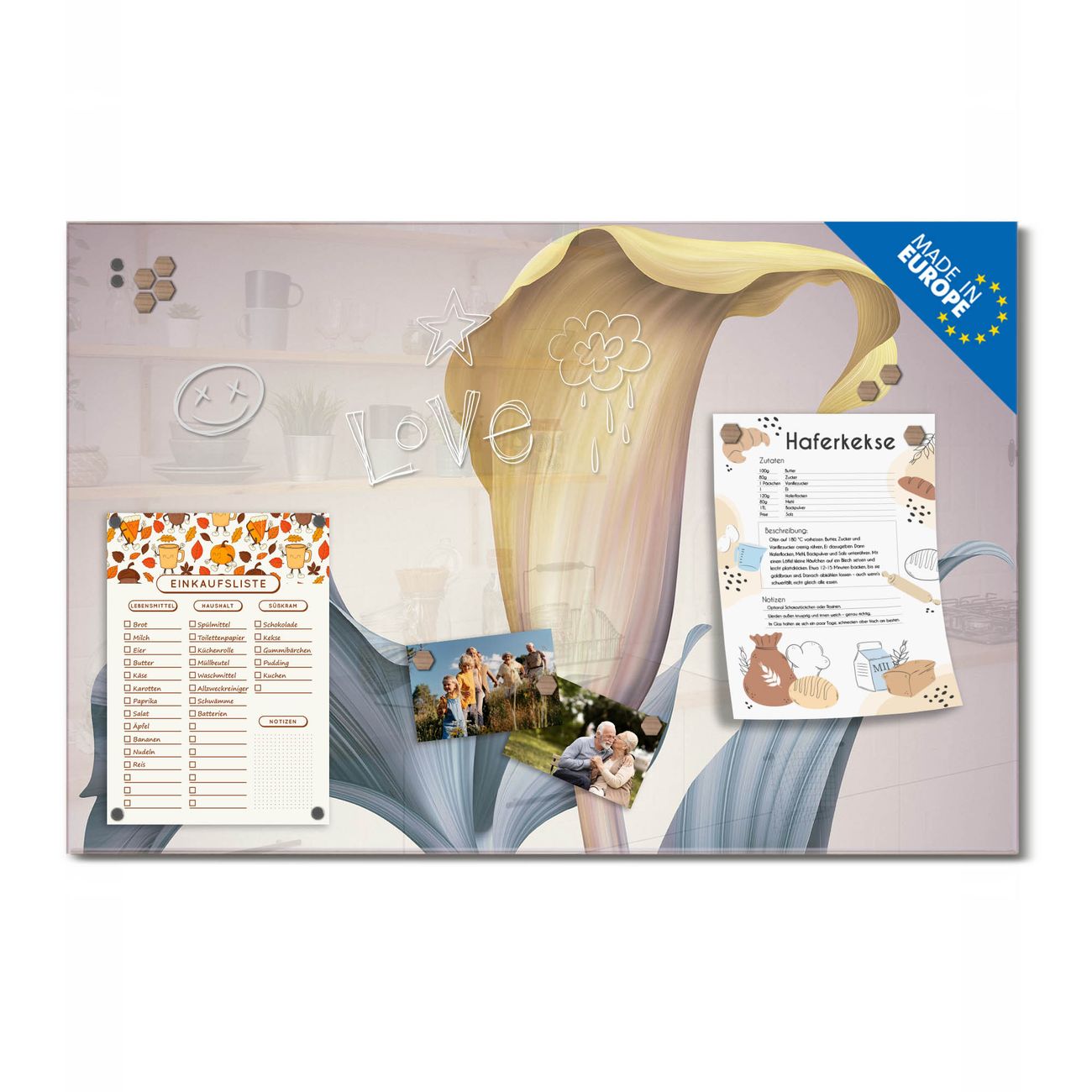 Ein Stück Design, das Ihren Alltag organisiert. Schreiben, heften, inspirieren - alles an einem Ort. Qualität, die man spürt. Montage leicht gemacht. Handwerk mit Herz - veredelt in Sachsen. Einzigartiges Design mit Motiv Motiv Calla Beschreibbare Glasoberfläche, leicht zu reinigen Starke Magnetkraft durch Stahlrückwand Inklusive 4 Neodym-Magneten Flexible Montageoptionen Handveredelt in Sachsen - Qualität, die bleibt