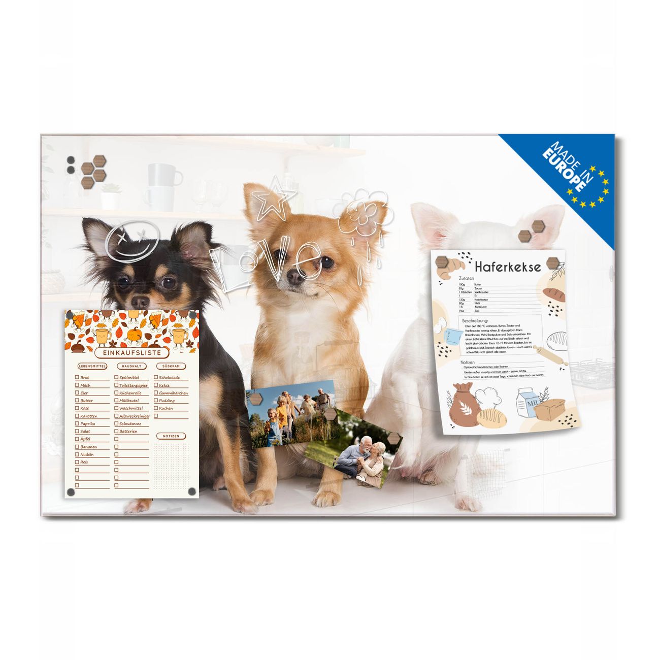 Ein Stück Design, das Ihren Alltag organisiert. Schreiben, heften, inspirieren - alles an einem Ort. Qualität, die man spürt. Montage leicht gemacht. Handwerk mit Herz - veredelt in Sachsen. Einzigartiges Design mit Motiv Motiv Chihuahua Beschreibbare Glasoberfläche, leicht zu reinigen Starke Magnetkraft durch Stahlrückwand Inklusive 4 Neodym-Magneten Flexible Montageoptionen Handveredelt in Sachsen - Qualität, die bleibt