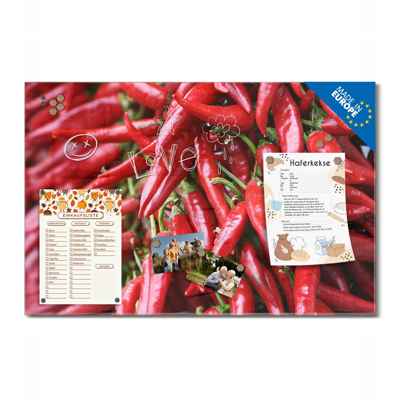 Ein Stück Design, das Ihren Alltag organisiert. Schreiben, heften, inspirieren - alles an einem Ort. Qualität, die man spürt. Montage leicht gemacht. Handwerk mit Herz - veredelt in Sachsen. Einzigartiges Design mit Motiv Motiv Chilli Beschreibbare Glasoberfläche, leicht zu reinigen Starke Magnetkraft durch Stahlrückwand Inklusive 4 Neodym-Magneten Flexible Montageoptionen Handveredelt in Sachsen - Qualität, die bleibt
