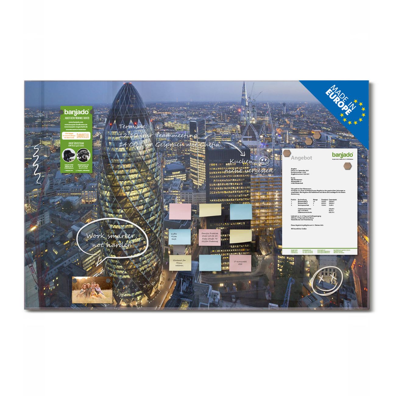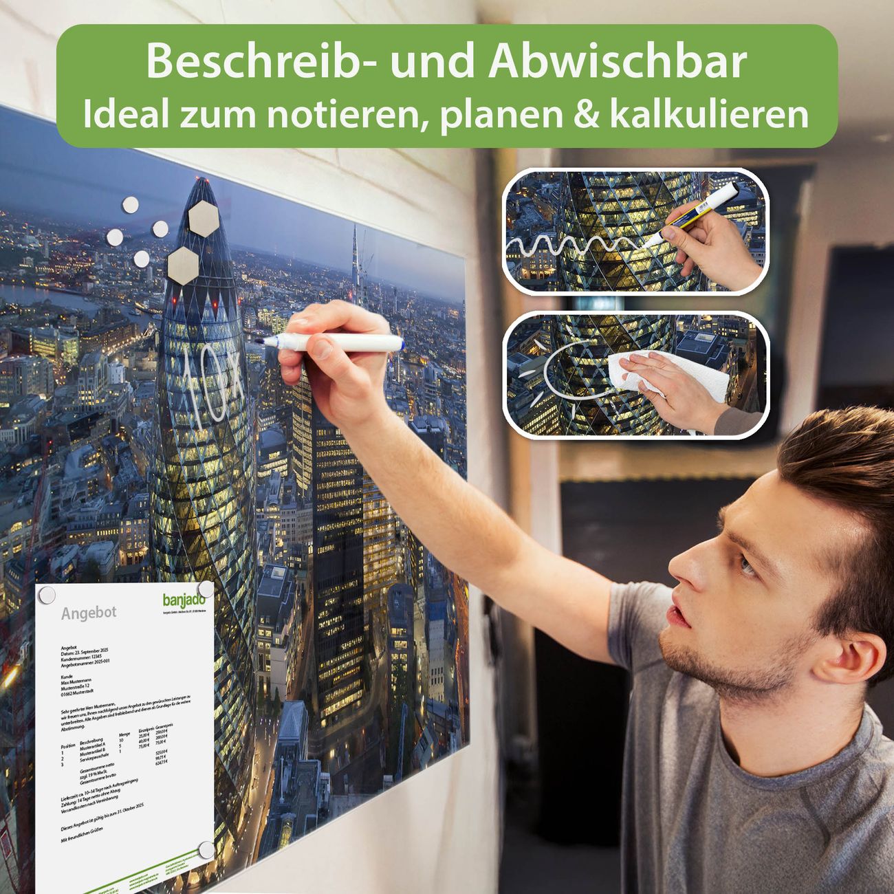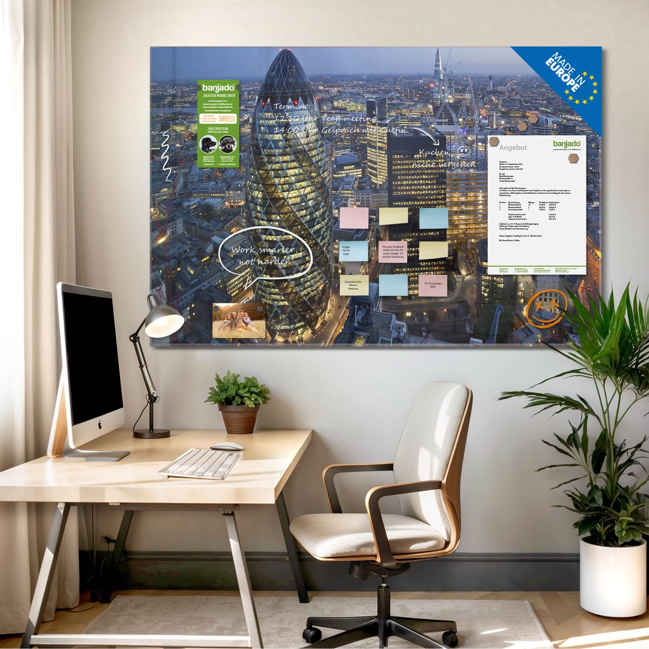 Jede Glas Magnettafel wird in unserer Werkstatt von Hand gefertigt und sorgfältig geprüft. So erhalten Sie ein echtes Qualitätsprodukt, das Funktion und Ästhetik perfekt vereint.?? Warum banjado?