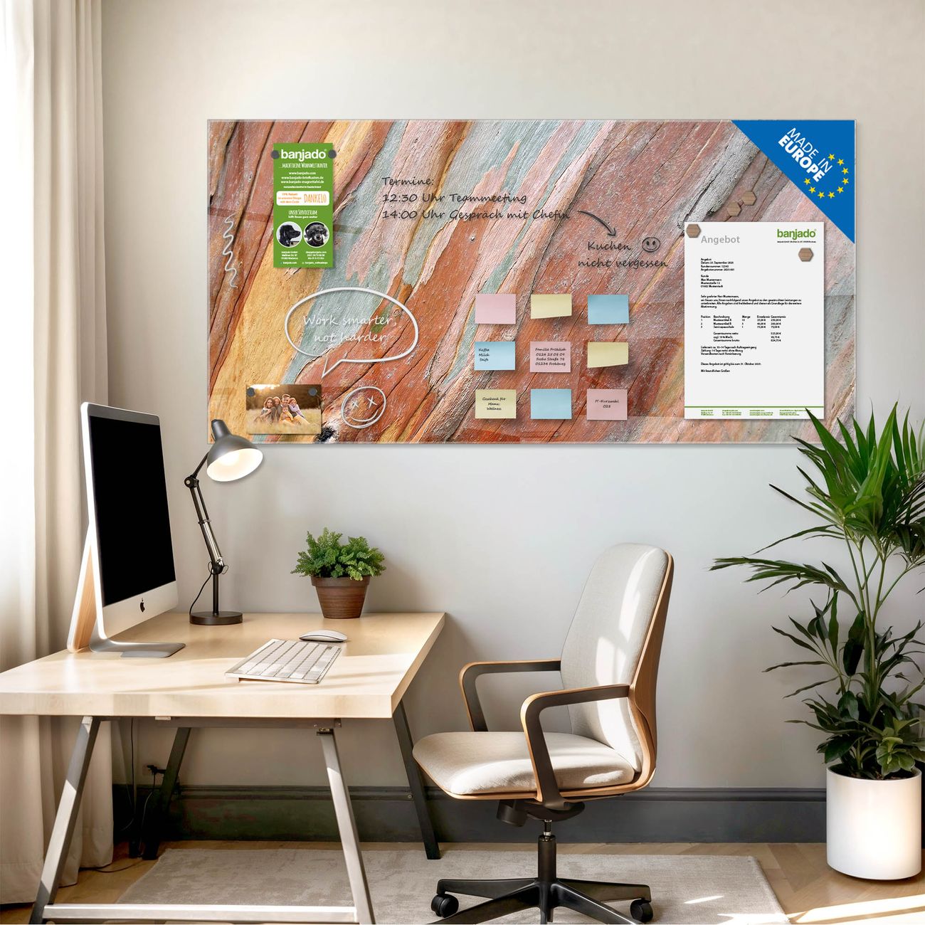Die banjado Glas Magnettafel mit dem Motiv Motiv Coloured Wood verbindet Funktionalität mit Stil. Sie ersetzt das Zettelchaos durch klare Strukturen und bringt dabei eine warme, natürliche Atmosphäre in Ihr Zuhause. Ob im Büro, in der Küche oder im Eingangsbereich - dieses Design-Board zieht Blicke an und sorgt für Ordnung mit Charakter.