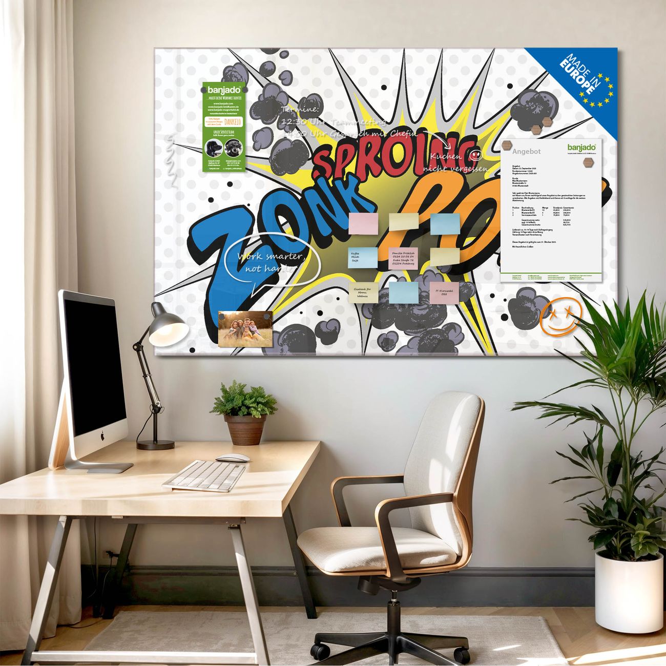 Die banjado Glas Magnettafel mit dem Motiv Motiv Comic verbindet Funktionalität mit Stil. Sie ersetzt das Zettelchaos durch klare Strukturen und bringt dabei eine warme, natürliche Atmosphäre in Ihr Zuhause. Ob im Büro, in der Küche oder im Eingangsbereich - dieses Design-Board zieht Blicke an und sorgt für Ordnung mit Charakter.
