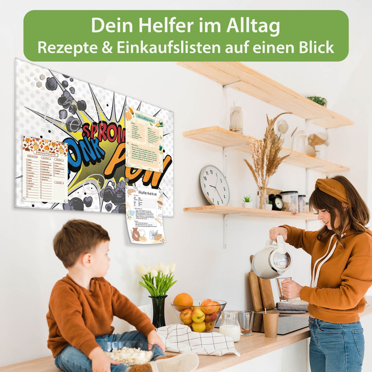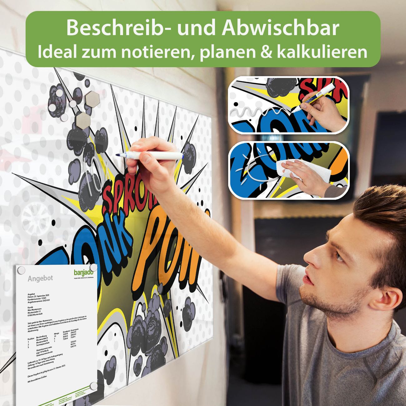 Ein Stück Design, das Ihren Alltag organisiert. Schreiben, heften, inspirieren - alles an einem Ort. Qualität, die man spürt. Montage leicht gemacht. Handwerk mit Herz - veredelt in Sachsen. Einzigartiges Design mit Motiv Motiv Comic Beschreibbare Glasoberfläche, leicht zu reinigen Starke Magnetkraft durch Stahlrückwand Inklusive 4 Neodym-Magneten Flexible Montageoptionen Handveredelt in Sachsen - Qualität, die bleibt