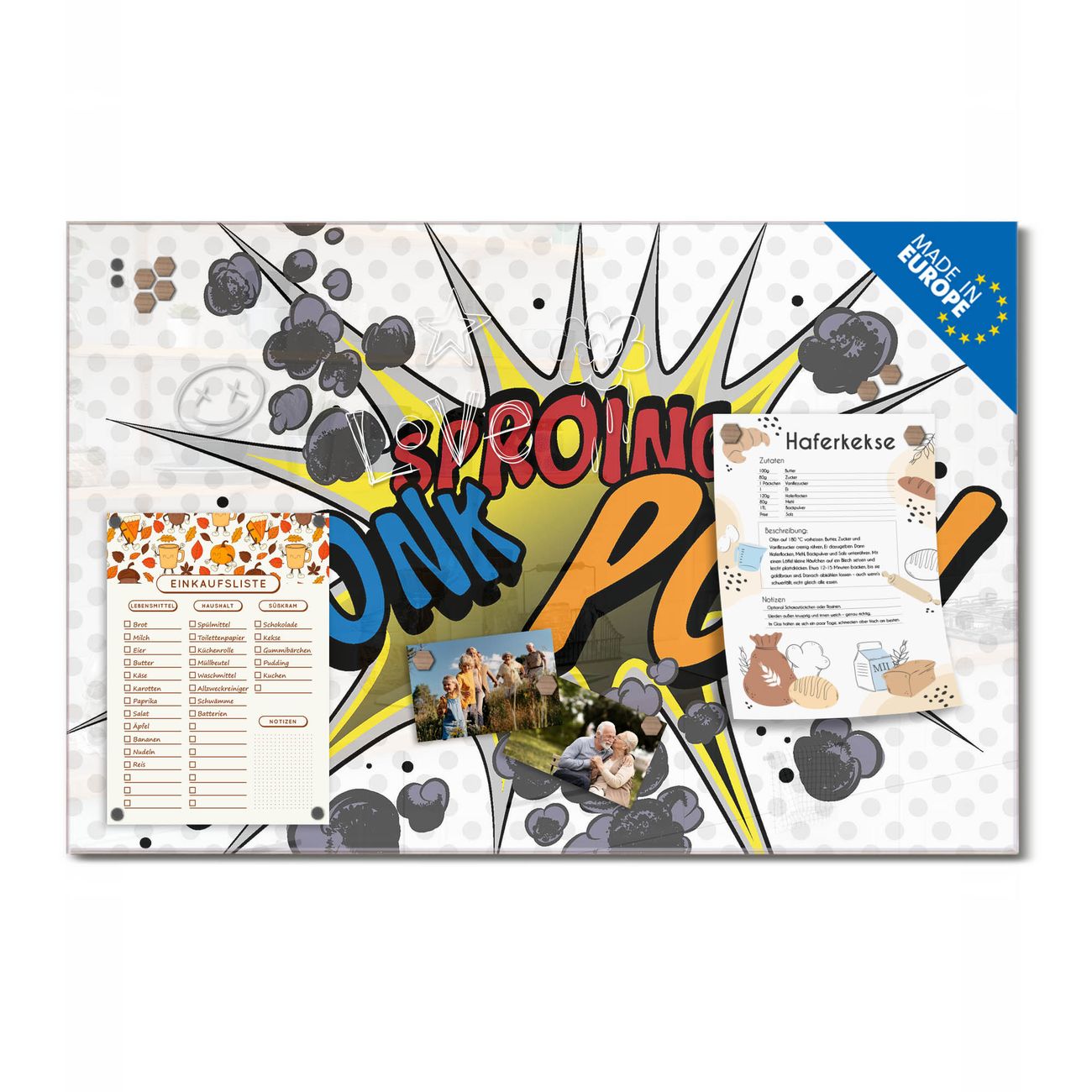 Ein Stück Design, das Ihren Alltag organisiert. Schreiben, heften, inspirieren - alles an einem Ort. Qualität, die man spürt. Montage leicht gemacht. Handwerk mit Herz - veredelt in Sachsen. Einzigartiges Design mit Motiv Motiv Comic Beschreibbare Glasoberfläche, leicht zu reinigen Starke Magnetkraft durch Stahlrückwand Inklusive 4 Neodym-Magneten Flexible Montageoptionen Handveredelt in Sachsen - Qualität, die bleibt