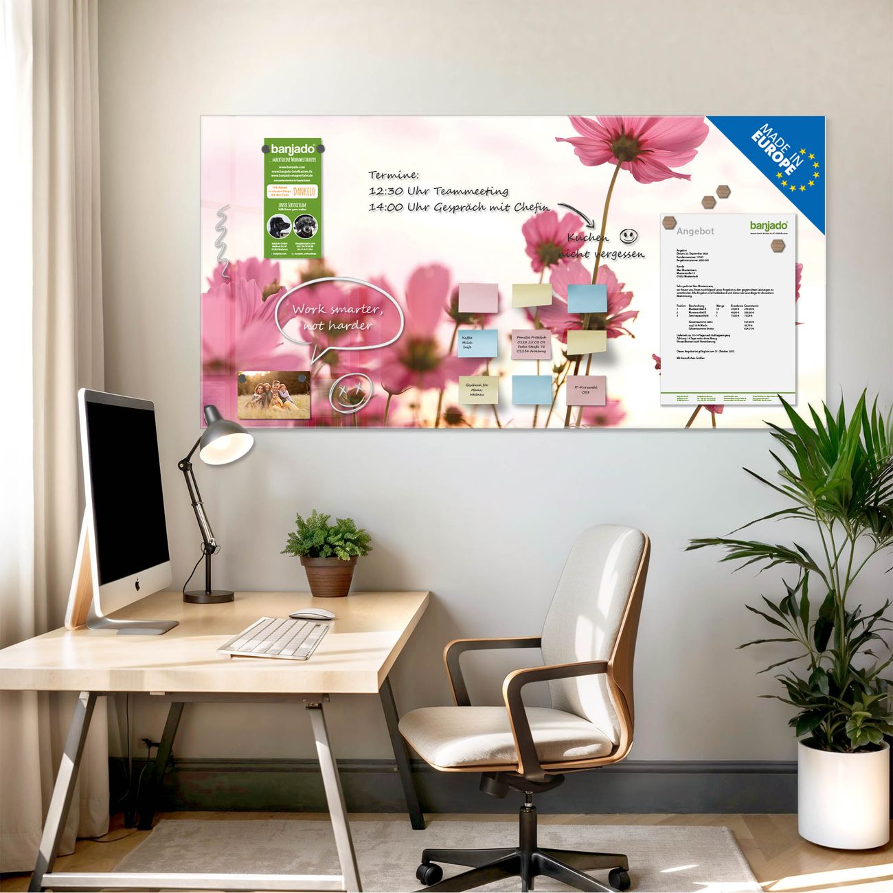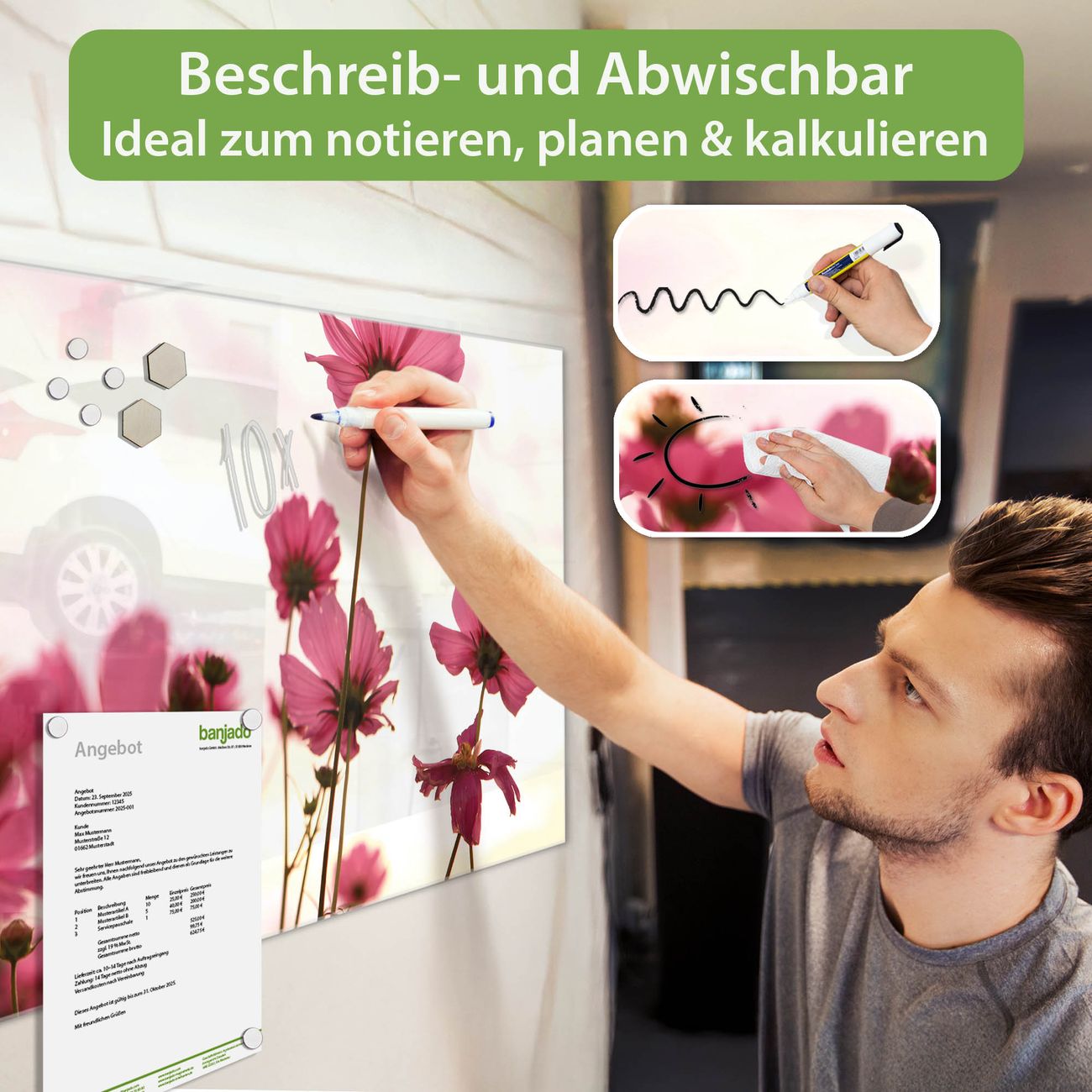 Die banjado Glas Magnettafel mit dem Motiv Motiv Cosmea verbindet Funktionalität mit Stil. Sie ersetzt das Zettelchaos durch klare Strukturen und bringt dabei eine warme, natürliche Atmosphäre in Ihr Zuhause. Ob im Büro, in der Küche oder im Eingangsbereich - dieses Design-Board zieht Blicke an und sorgt für Ordnung mit Charakter.