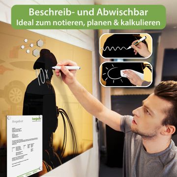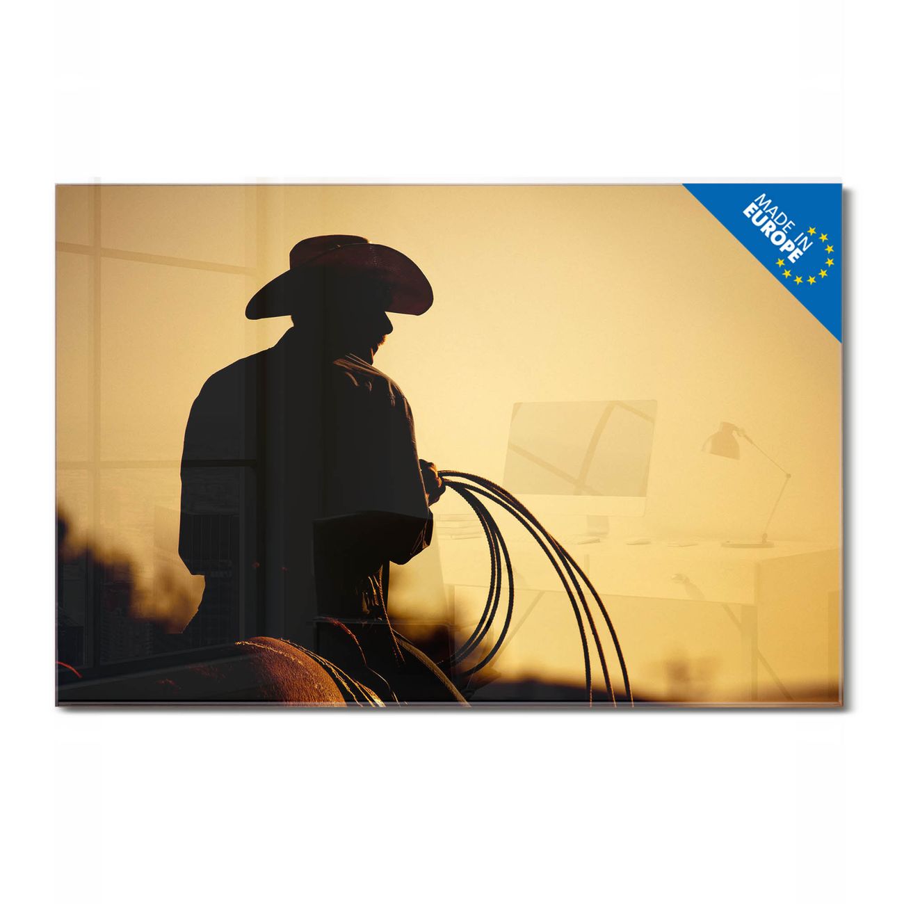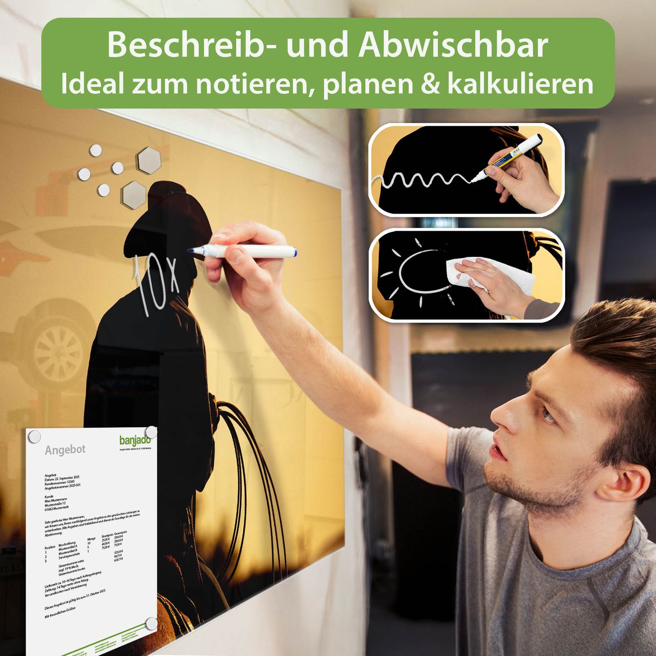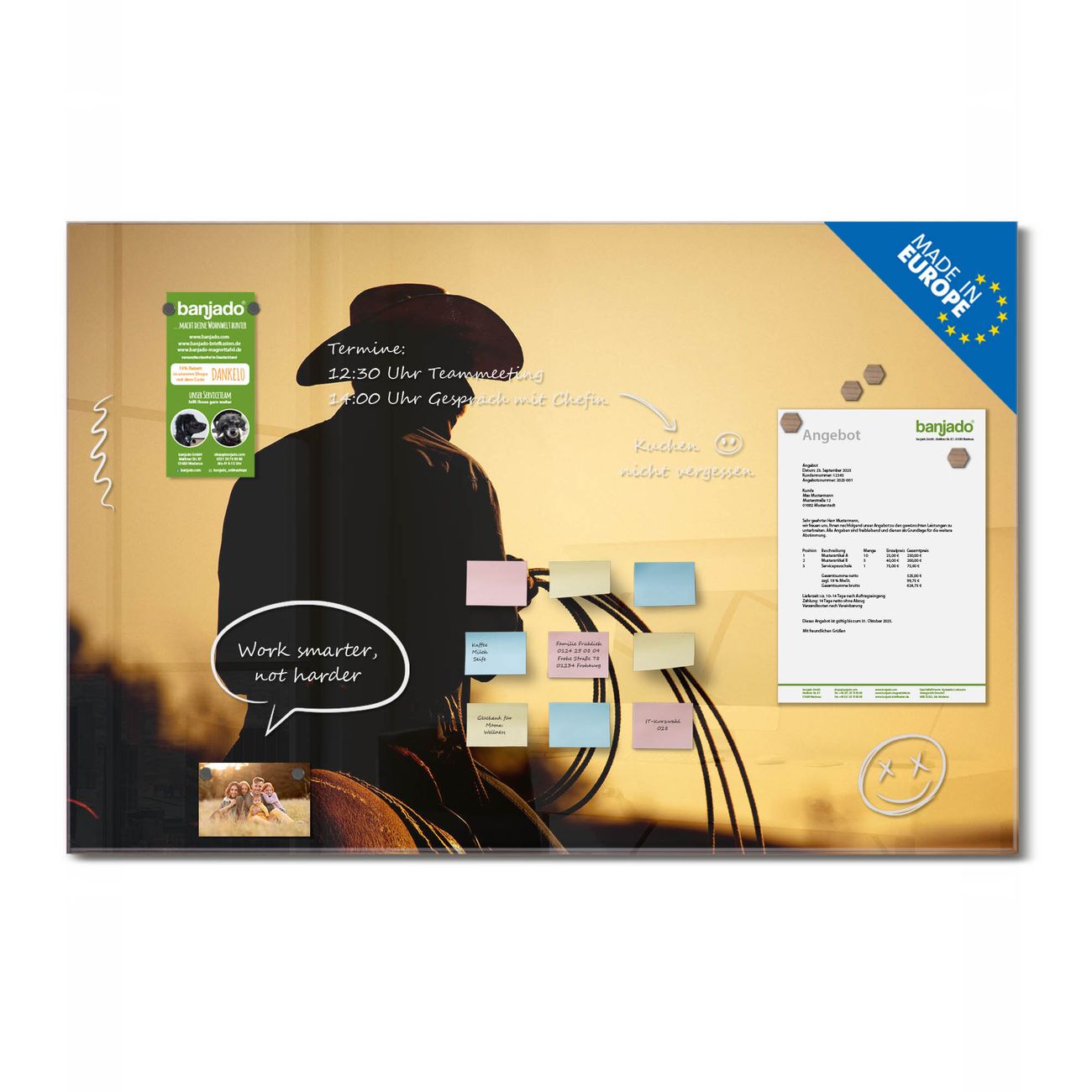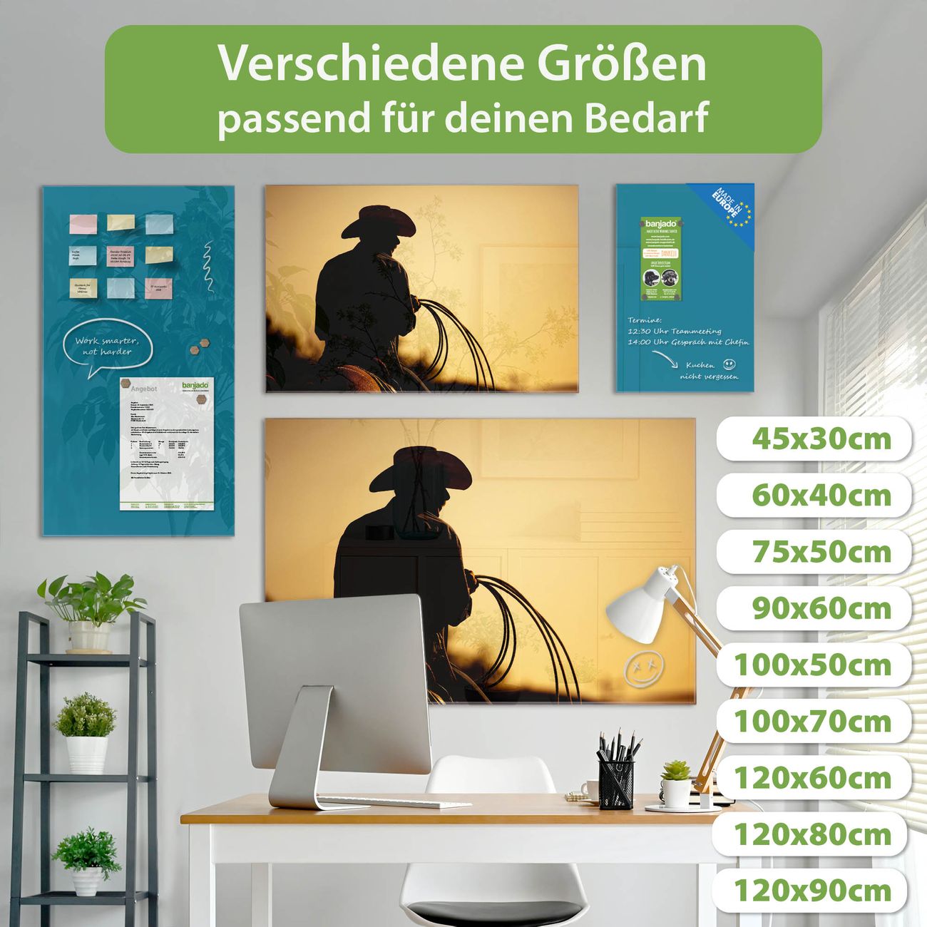 Die banjado Glas Magnettafel mit dem Motiv Motiv Cowboy verbindet Funktionalität mit Stil. Sie ersetzt das Zettelchaos durch klare Strukturen und bringt dabei eine warme, natürliche Atmosphäre in Ihr Zuhause. Ob im Büro, in der Küche oder im Eingangsbereich - dieses Design-Board zieht Blicke an und sorgt für Ordnung mit Charakter.
