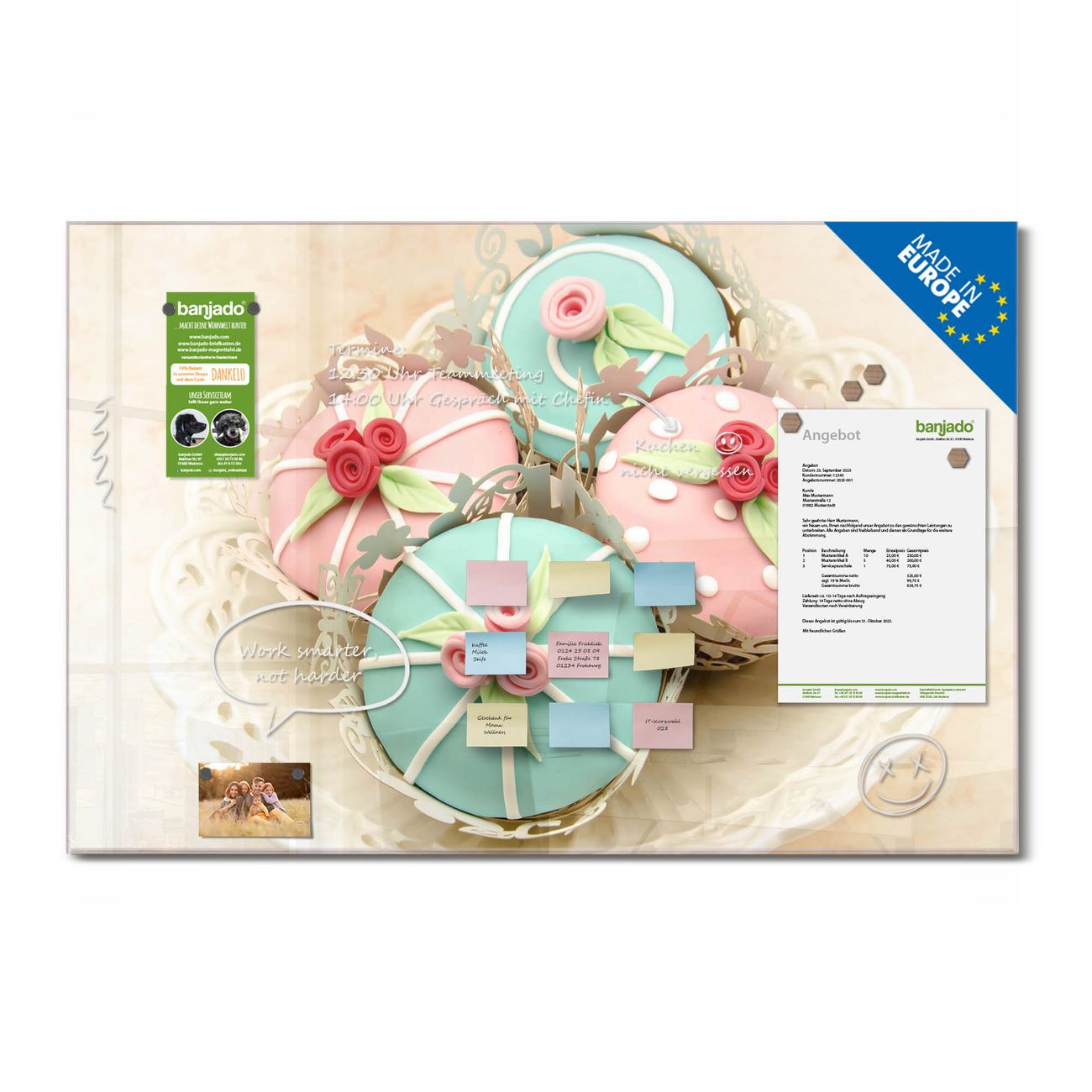 Ein Stück Design, das Ihren Alltag organisiert. Schreiben, heften, inspirieren - alles an einem Ort. Qualität, die man spürt. Montage leicht gemacht. Handwerk mit Herz - veredelt in Sachsen. Einzigartiges Design mit Motiv Motiv Cupcakes Beschreibbare Glasoberfläche, leicht zu reinigen Starke Magnetkraft durch Stahlrückwand Inklusive 4 Neodym-Magneten Flexible Montageoptionen Handveredelt in Sachsen - Qualität, die bleibt