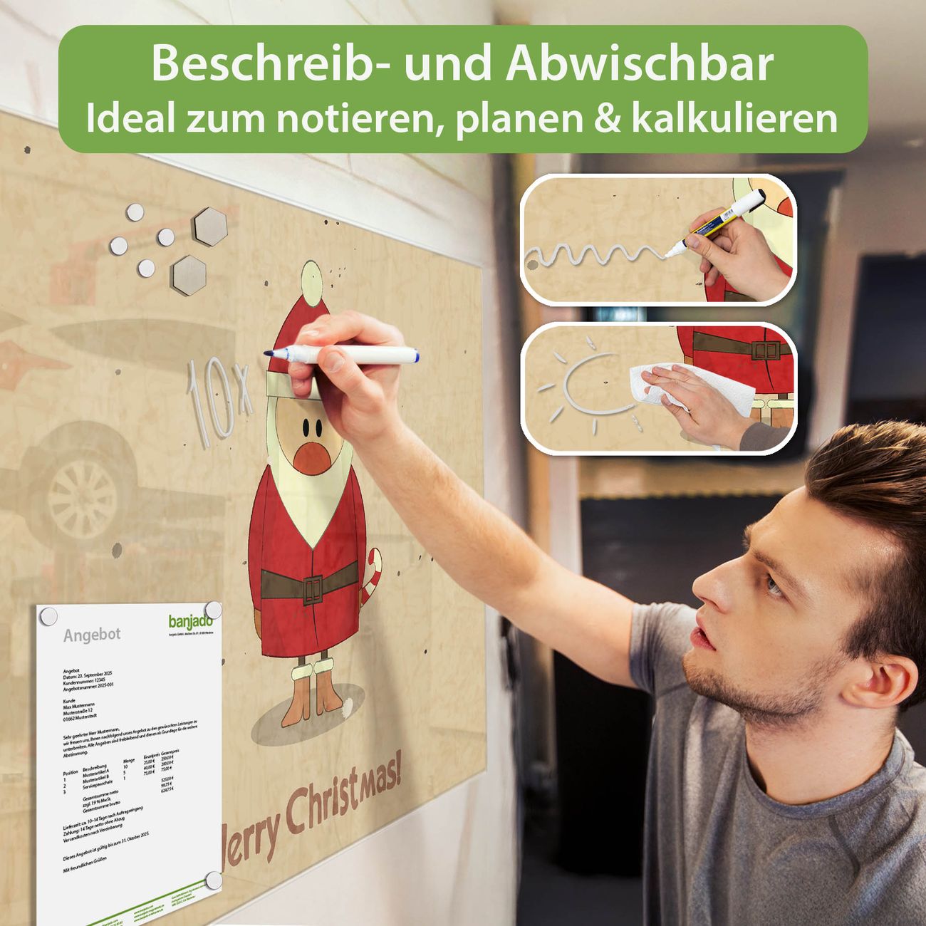 Die banjado Glas Magnettafel mit dem Motiv Motiv Cute Claus verbindet Funktionalität mit Stil. Sie ersetzt das Zettelchaos durch klare Strukturen und bringt dabei eine warme, natürliche Atmosphäre in Ihr Zuhause. Ob im Büro, in der Küche oder im Eingangsbereich - dieses Design-Board zieht Blicke an und sorgt für Ordnung mit Charakter.
