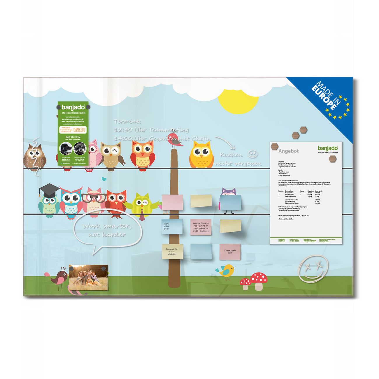 Jede Glas Magnettafel wird in unserer Werkstatt von Hand gefertigt und sorgfältig geprüft. So erhalten Sie ein echtes Qualitätsprodukt, das Funktion und Ästhetik perfekt vereint.?? Warum banjado?