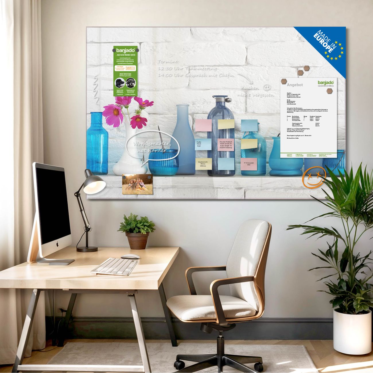 Jede Glas Magnettafel wird in unserer Werkstatt von Hand gefertigt und sorgfältig geprüft. So erhalten Sie ein echtes Qualitätsprodukt, das Funktion und Ästhetik perfekt vereint.?? Warum banjado?