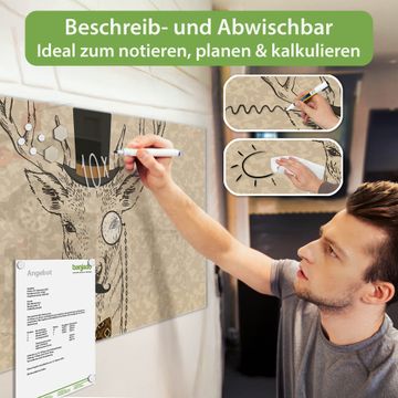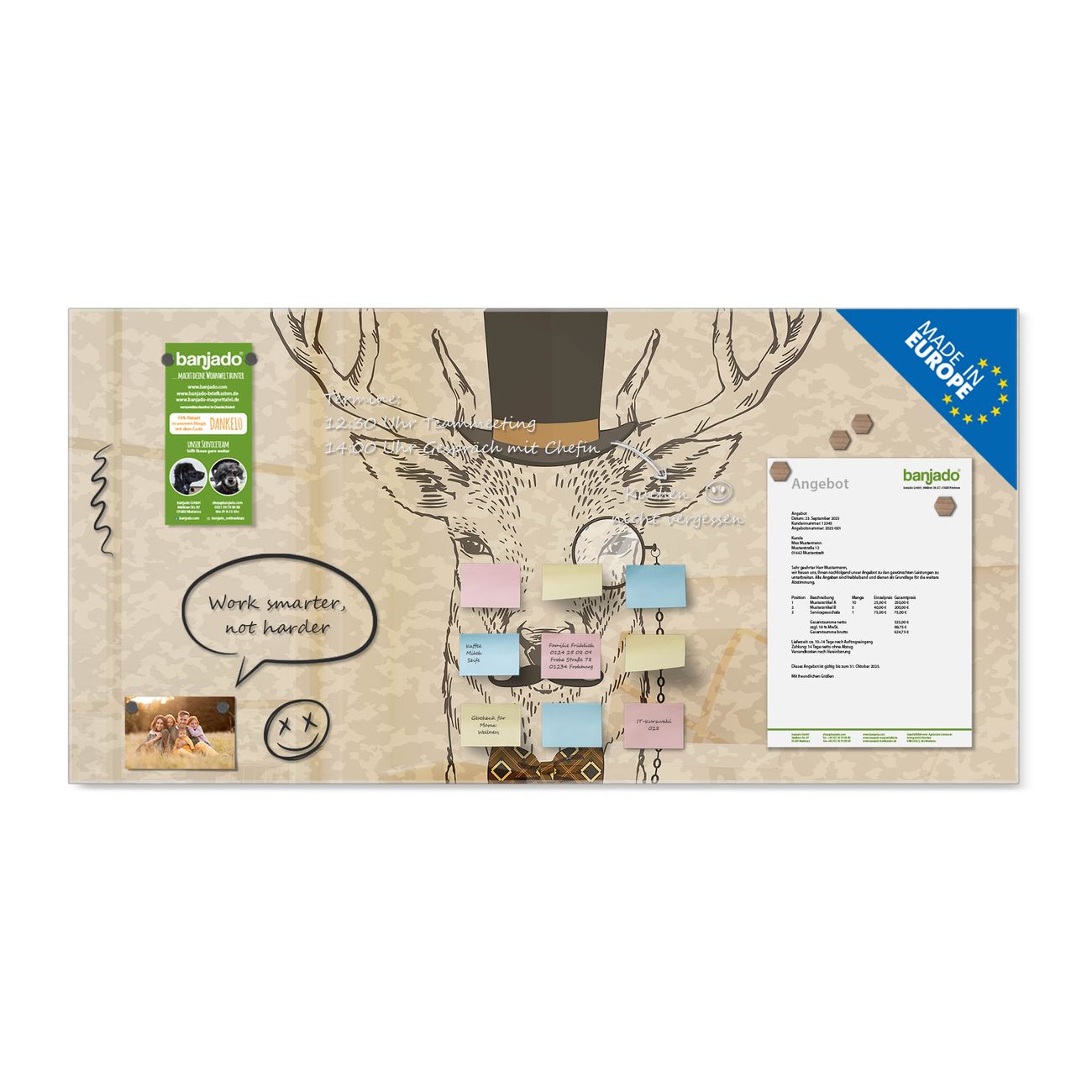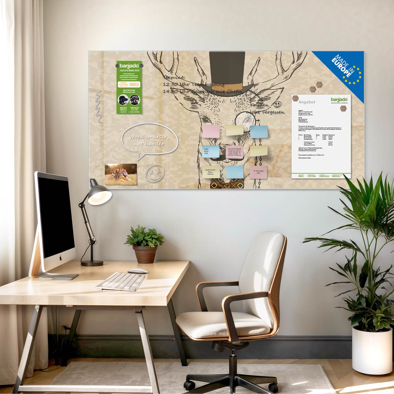 Die banjado Glas Magnettafel mit dem Motiv Motiv Direktor Hirsch verbindet Funktionalität mit Stil. Sie ersetzt das Zettelchaos durch klare Strukturen und bringt dabei eine warme, natürliche Atmosphäre in Ihr Zuhause. Ob im Büro, in der Küche oder im Eingangsbereich - dieses Design-Board zieht Blicke an und sorgt für Ordnung mit Charakter.