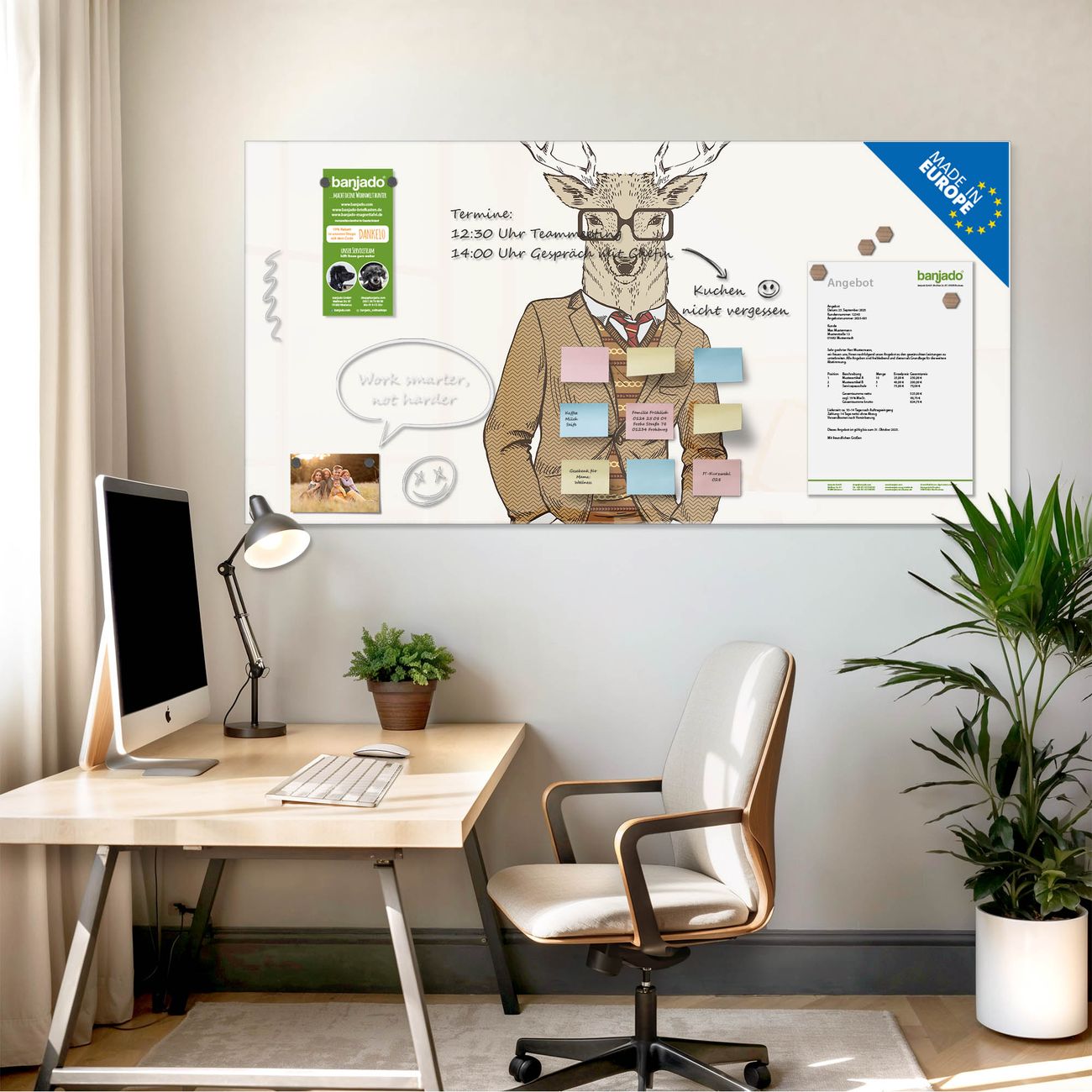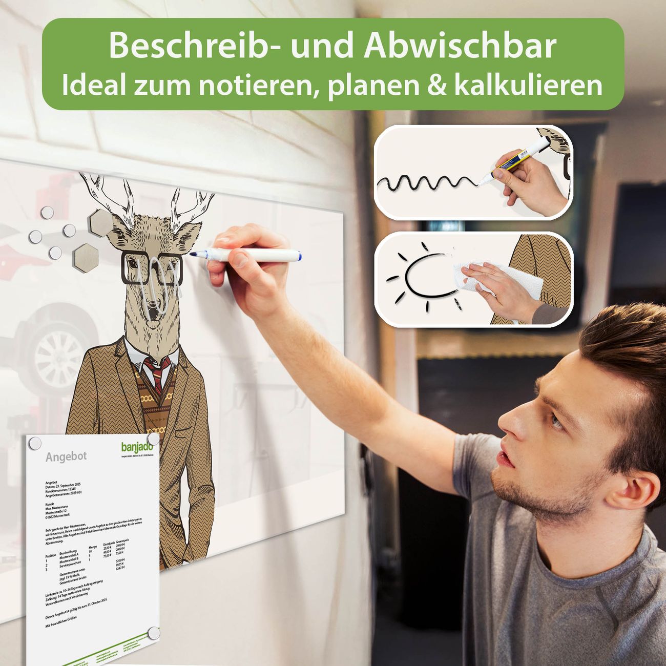 Jede Glas Magnettafel wird in unserer Werkstatt von Hand gefertigt und sorgfältig geprüft. So erhalten Sie ein echtes Qualitätsprodukt, das Funktion und Ästhetik perfekt vereint.?? Warum banjado?