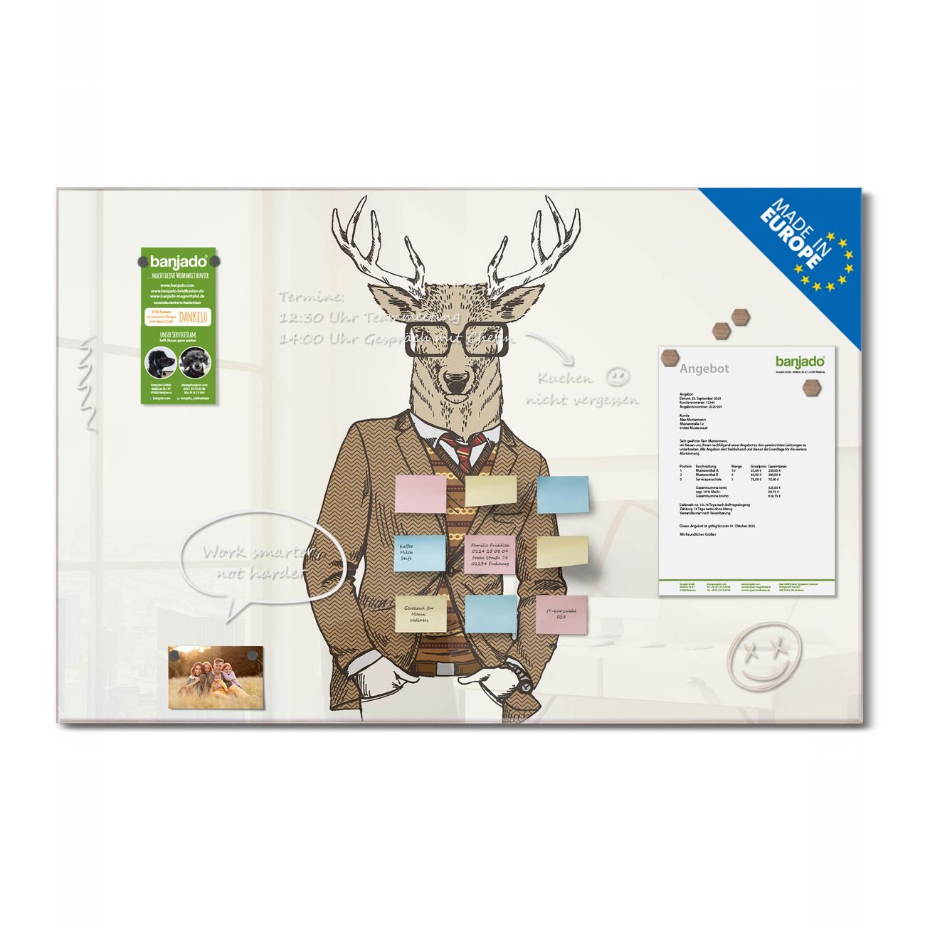 Jede Glas Magnettafel wird in unserer Werkstatt von Hand gefertigt und sorgfältig geprüft. So erhalten Sie ein echtes Qualitätsprodukt, das Funktion und Ästhetik perfekt vereint.?? Warum banjado?