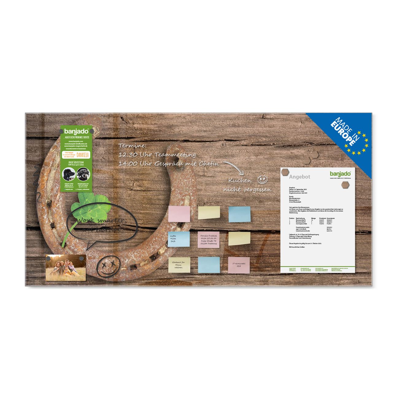 Jede Glas Magnettafel wird in unserer Werkstatt von Hand gefertigt und sorgfältig geprüft. So erhalten Sie ein echtes Qualitätsprodukt, das Funktion und Ästhetik perfekt vereint.?? Warum banjado?