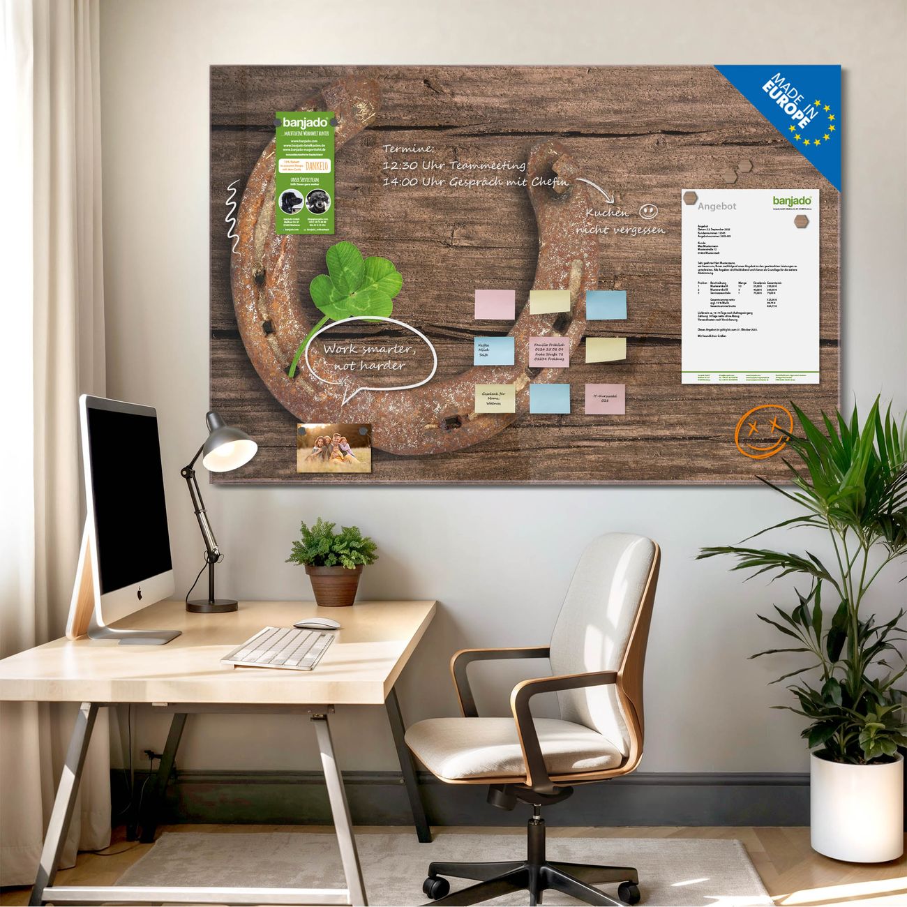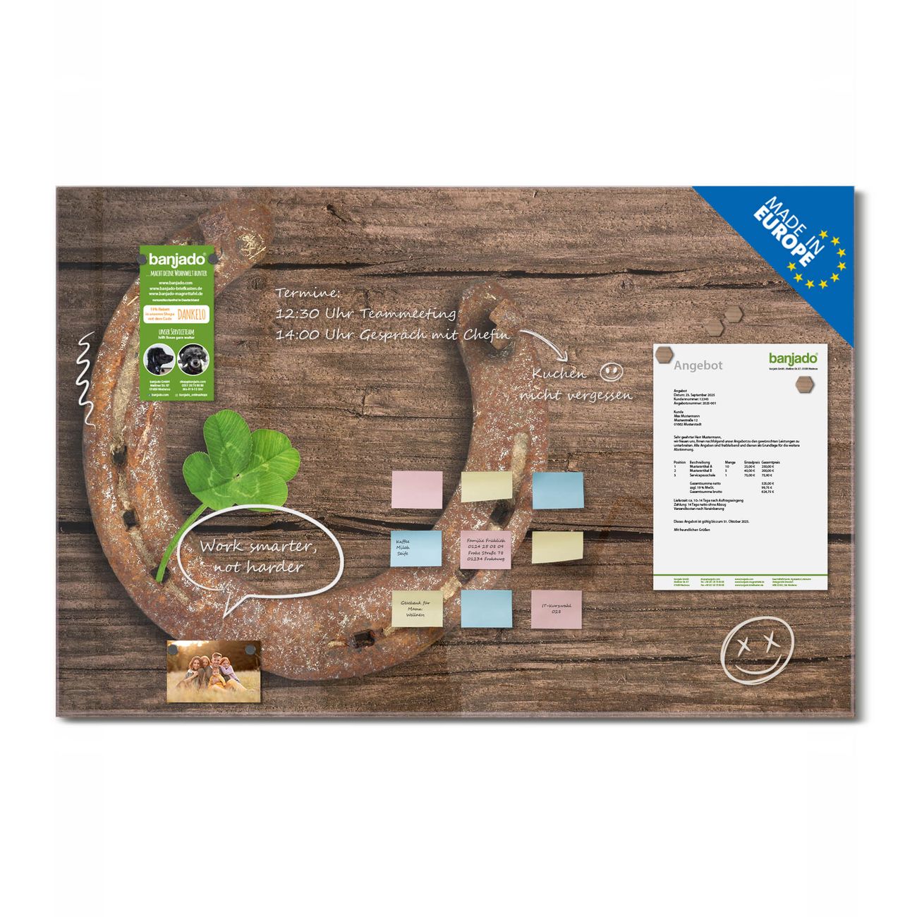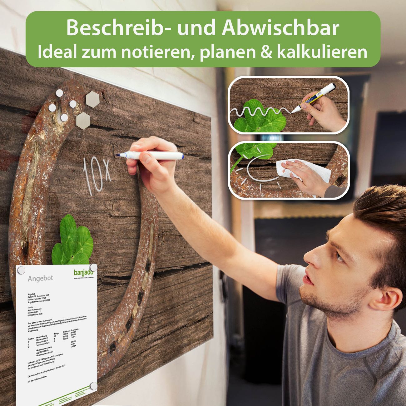 Jede Glas Magnettafel wird in unserer Werkstatt von Hand gefertigt und sorgfältig geprüft. So erhalten Sie ein echtes Qualitätsprodukt, das Funktion und Ästhetik perfekt vereint.?? Warum banjado?