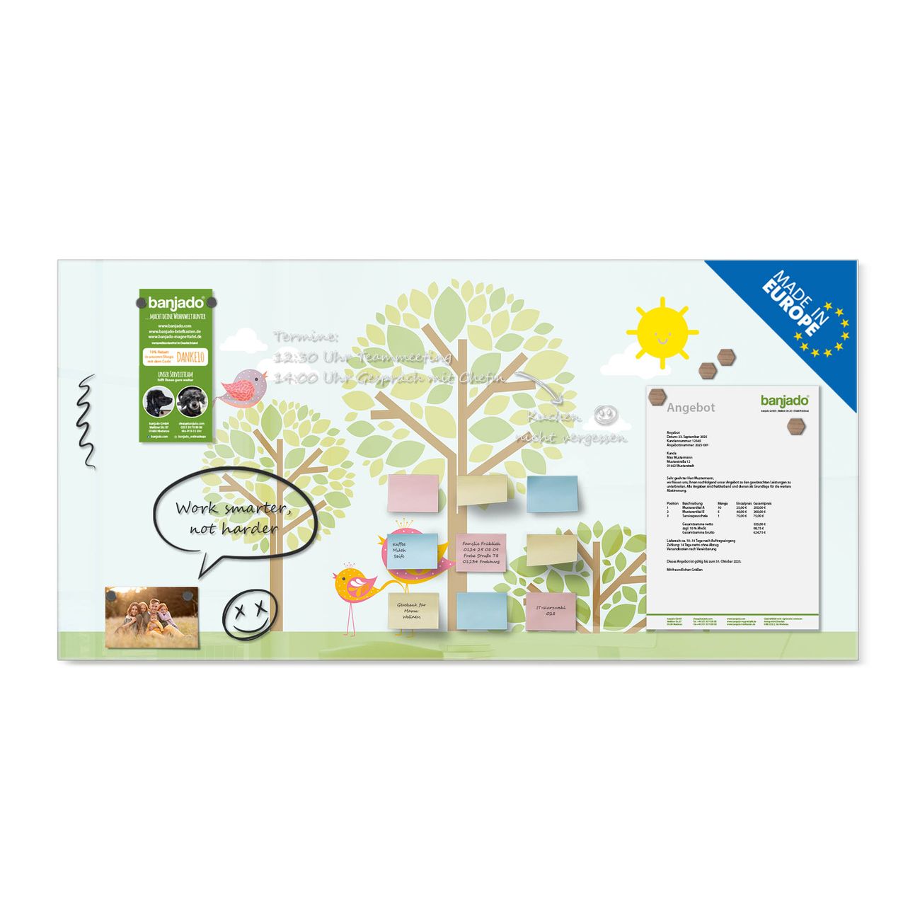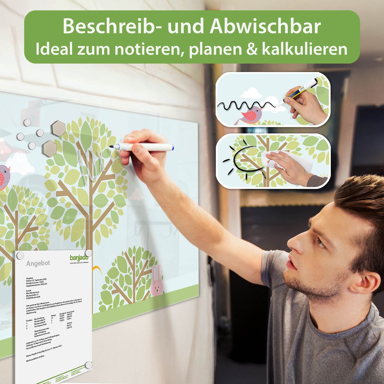 Jede Glas Magnettafel wird in unserer Werkstatt von Hand gefertigt und sorgfältig geprüft. So erhalten Sie ein echtes Qualitätsprodukt, das Funktion und Ästhetik perfekt vereint.?? Warum banjado?