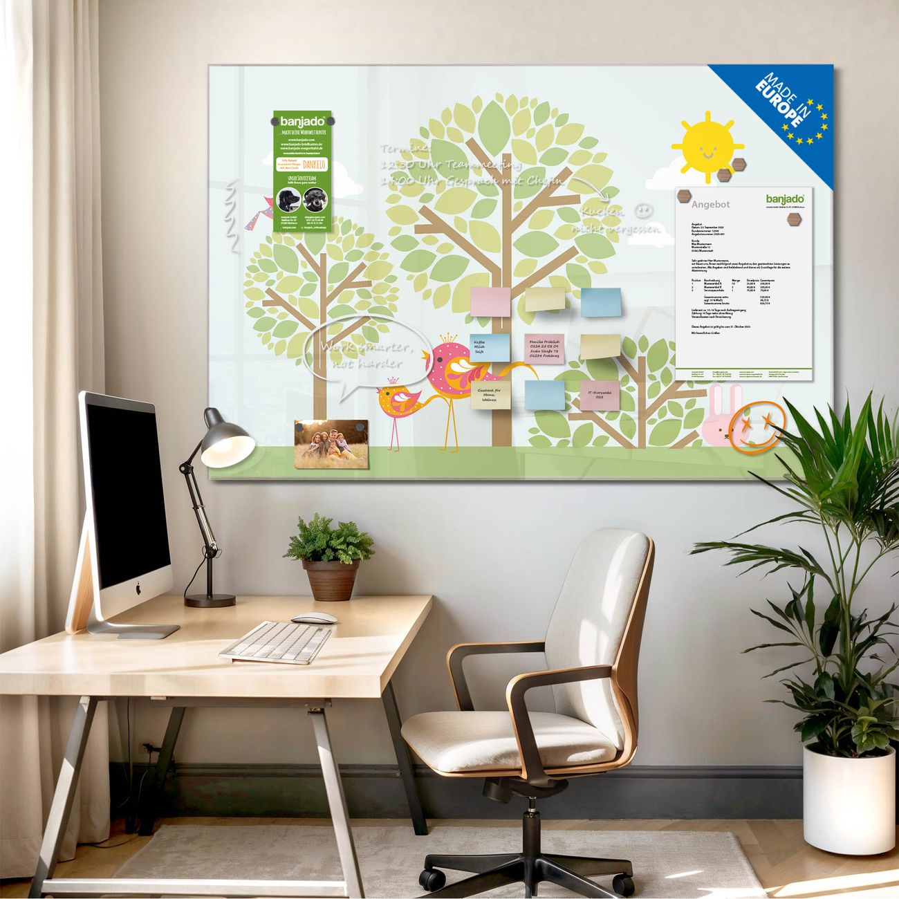 Jede Glas Magnettafel wird in unserer Werkstatt von Hand gefertigt und sorgfältig geprüft. So erhalten Sie ein echtes Qualitätsprodukt, das Funktion und Ästhetik perfekt vereint.?? Warum banjado?