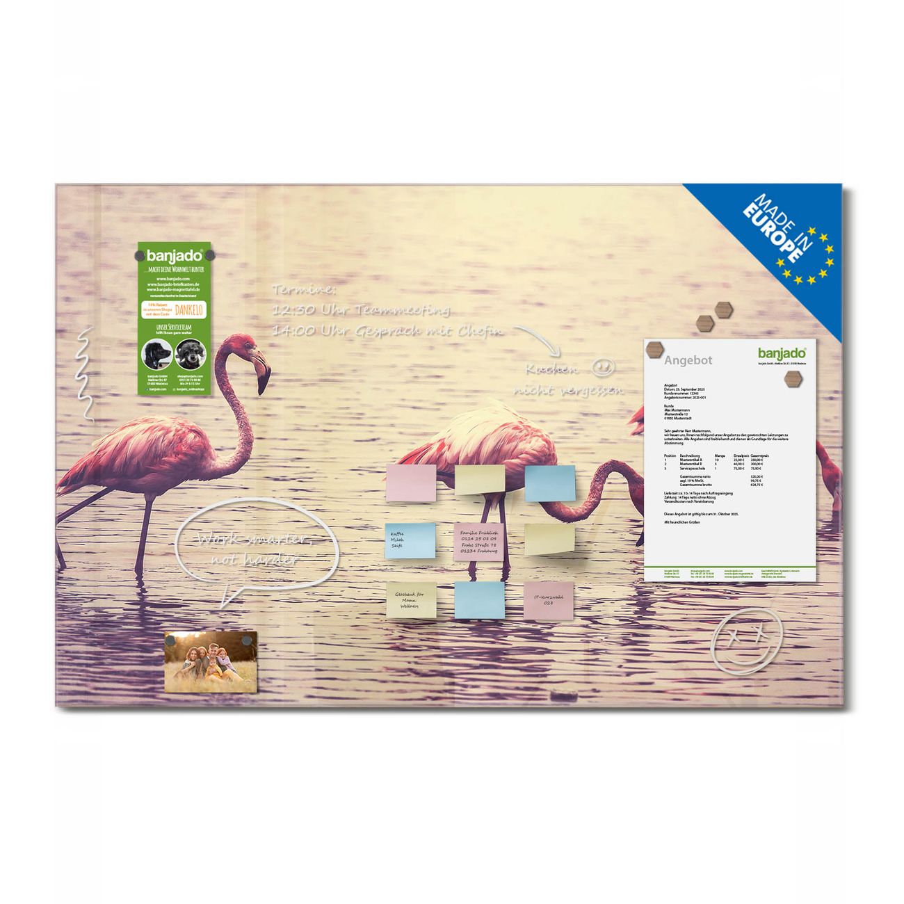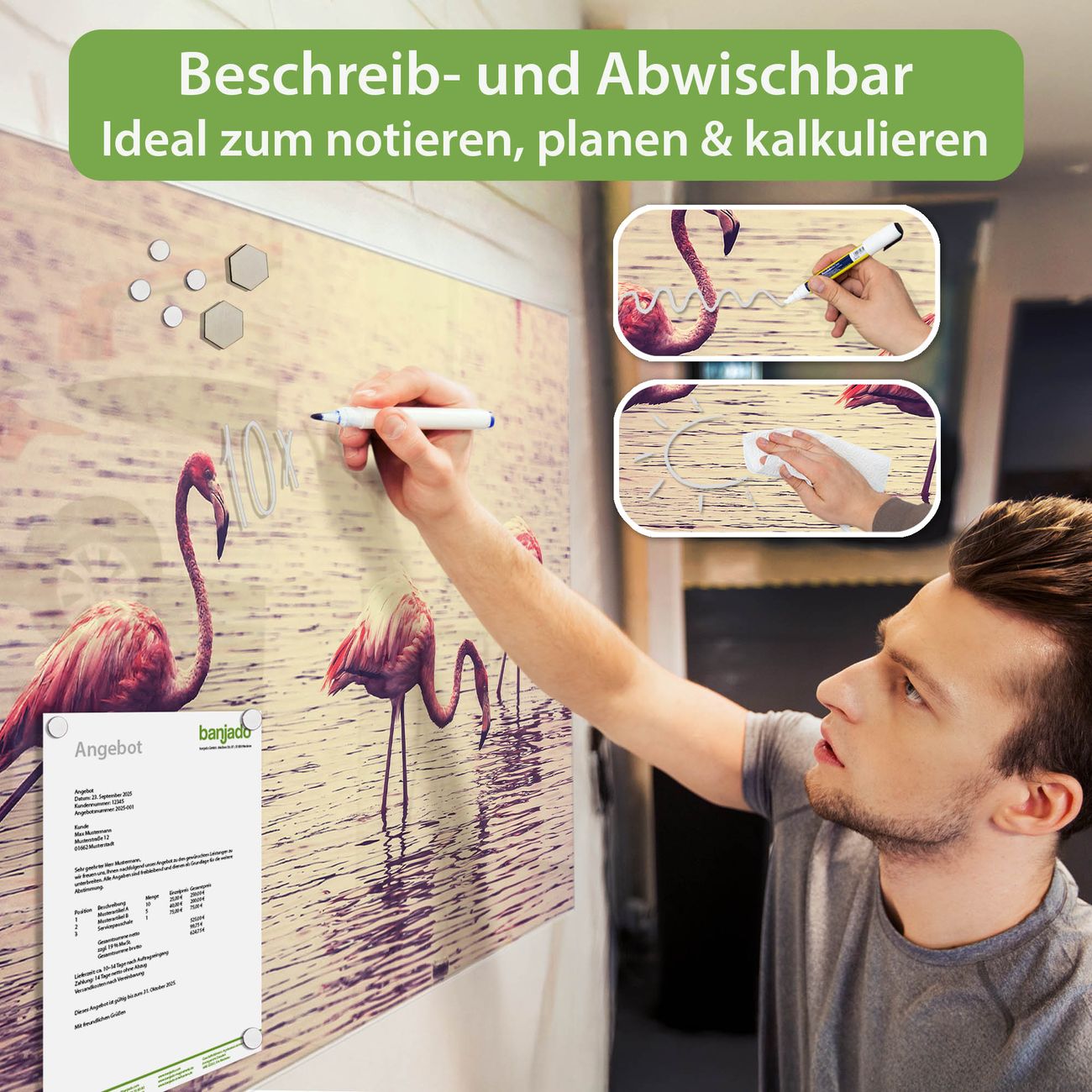Jede Glas Magnettafel wird in unserer Werkstatt von Hand gefertigt und sorgfältig geprüft. So erhalten Sie ein echtes Qualitätsprodukt, das Funktion und Ästhetik perfekt vereint.?? Warum banjado?