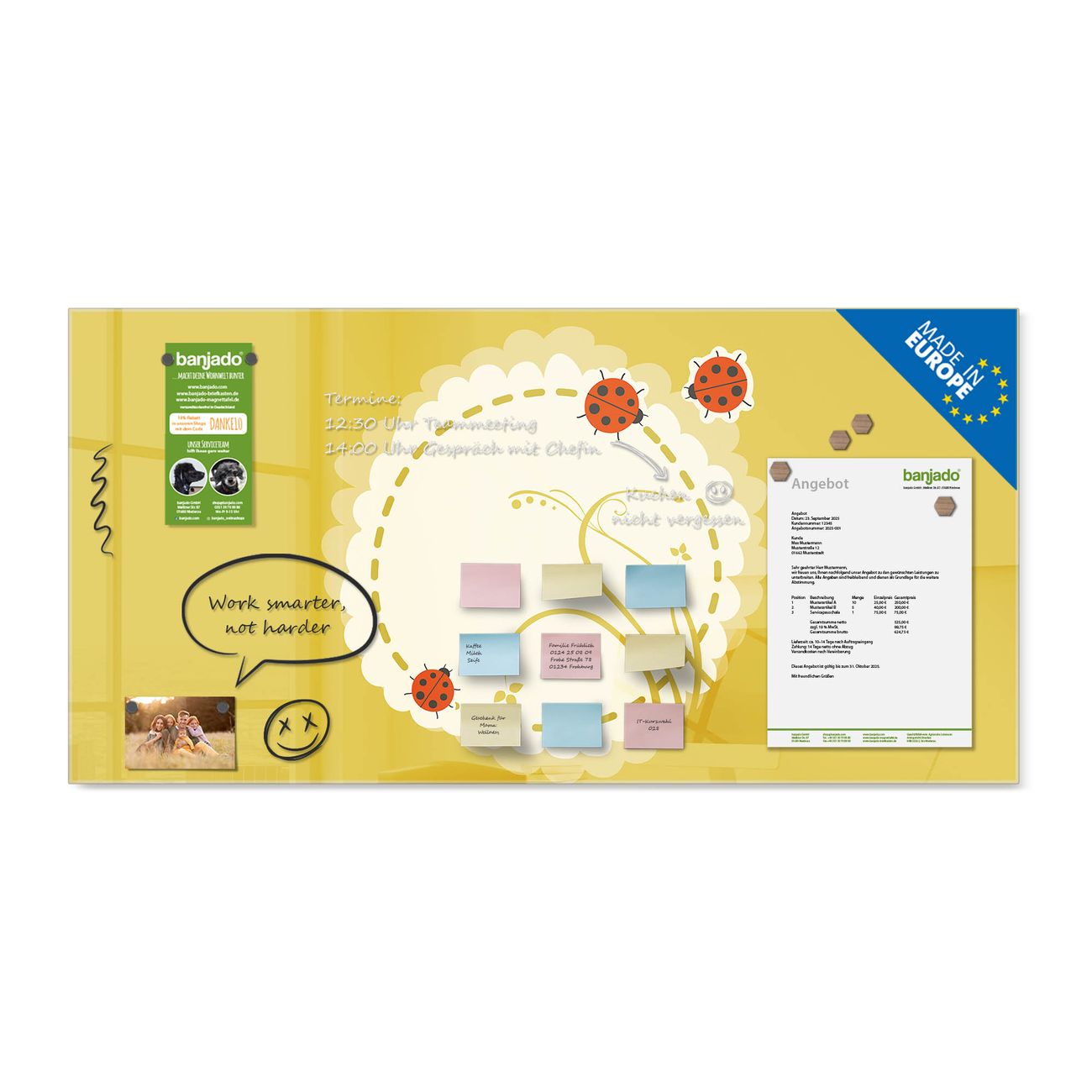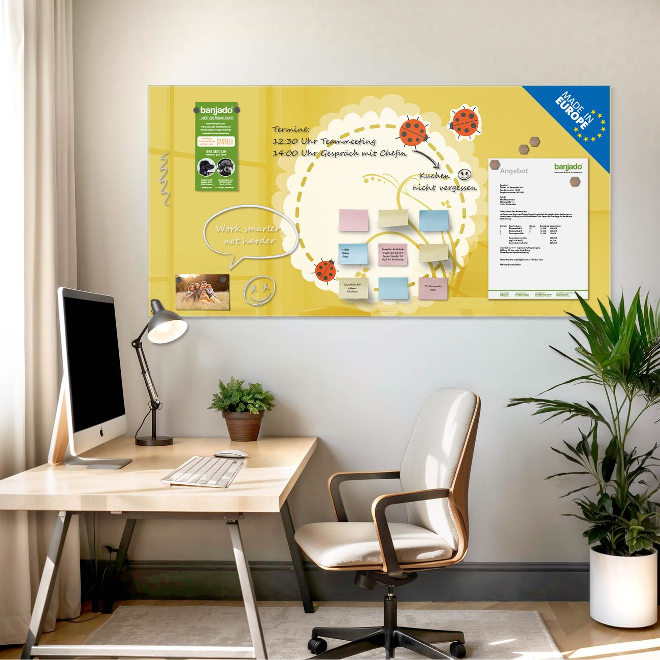 Jede Glas Magnettafel wird in unserer Werkstatt von Hand gefertigt und sorgfältig geprüft. So erhalten Sie ein echtes Qualitätsprodukt, das Funktion und Ästhetik perfekt vereint.?? Warum banjado?