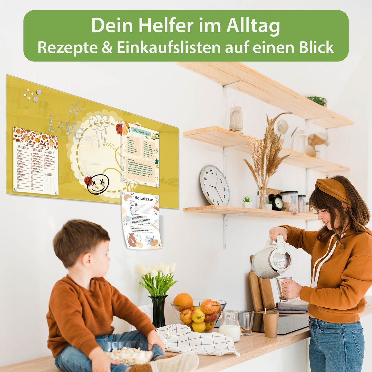 Auf der glatten Glasoberfläche lassen sich Termine, Rezepte oder Notizen ganz einfach mit Kreidestiften festhalten und rückstandslos entfernen. Starke Neodym-Magnete halten Ihre wichtigsten Erinnerungen sicher an Ort und Stelle. So entsteht Ihre ganz persönliche Ideenwand - jeden Tag neu.
