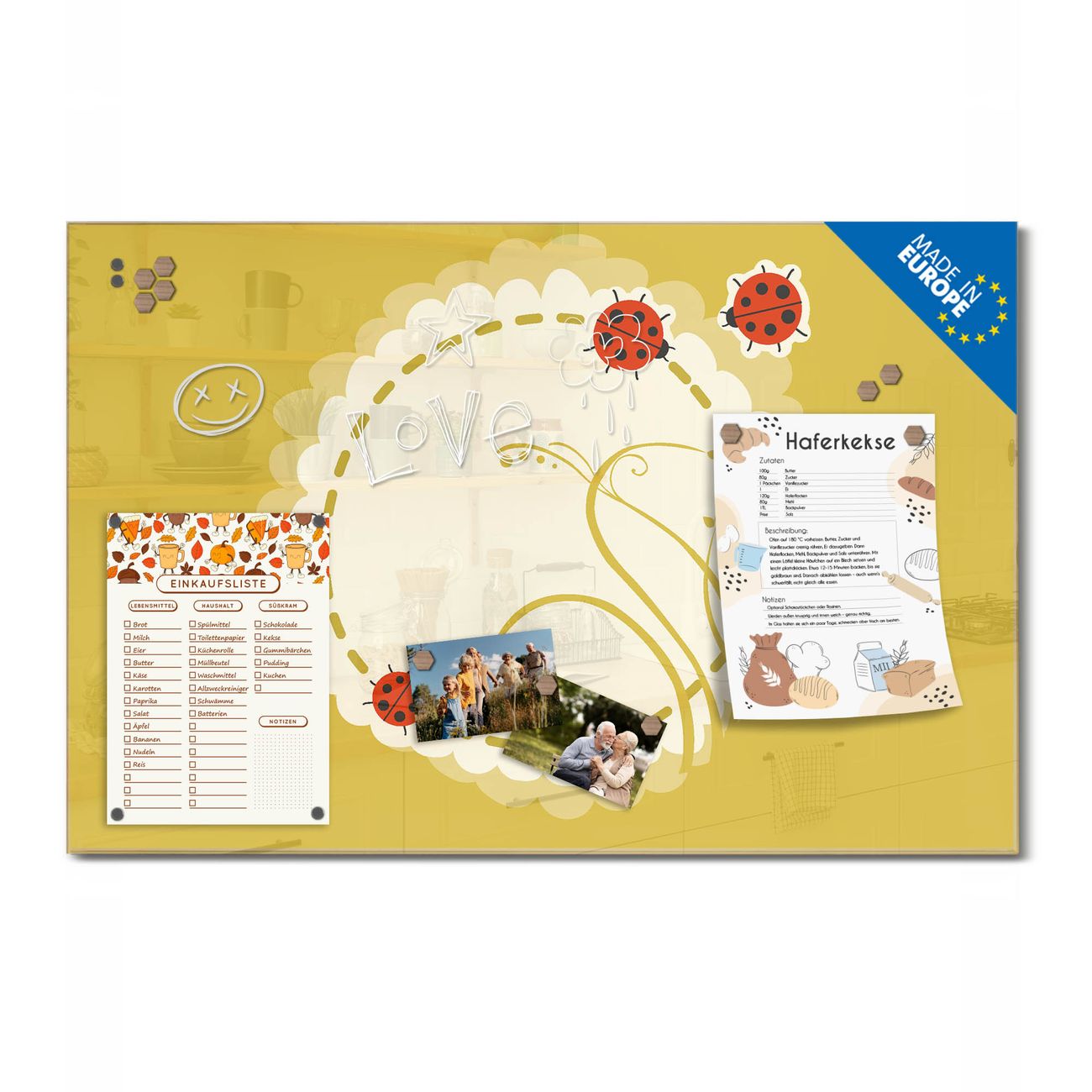 Ein Stück Design, das Ihren Alltag organisiert. Schreiben, heften, inspirieren - alles an einem Ort. Qualität, die man spürt. Montage leicht gemacht. Handwerk mit Herz - veredelt in Sachsen. Einzigartiges Design mit Motiv Motiv Drei Marienkäfer Beschreibbare Glasoberfläche, leicht zu reinigen Starke Magnetkraft durch Stahlrückwand Inklusive 4 Neodym-Magneten Flexible Montageoptionen Handveredelt in Sachsen - Qualität, die bleibt