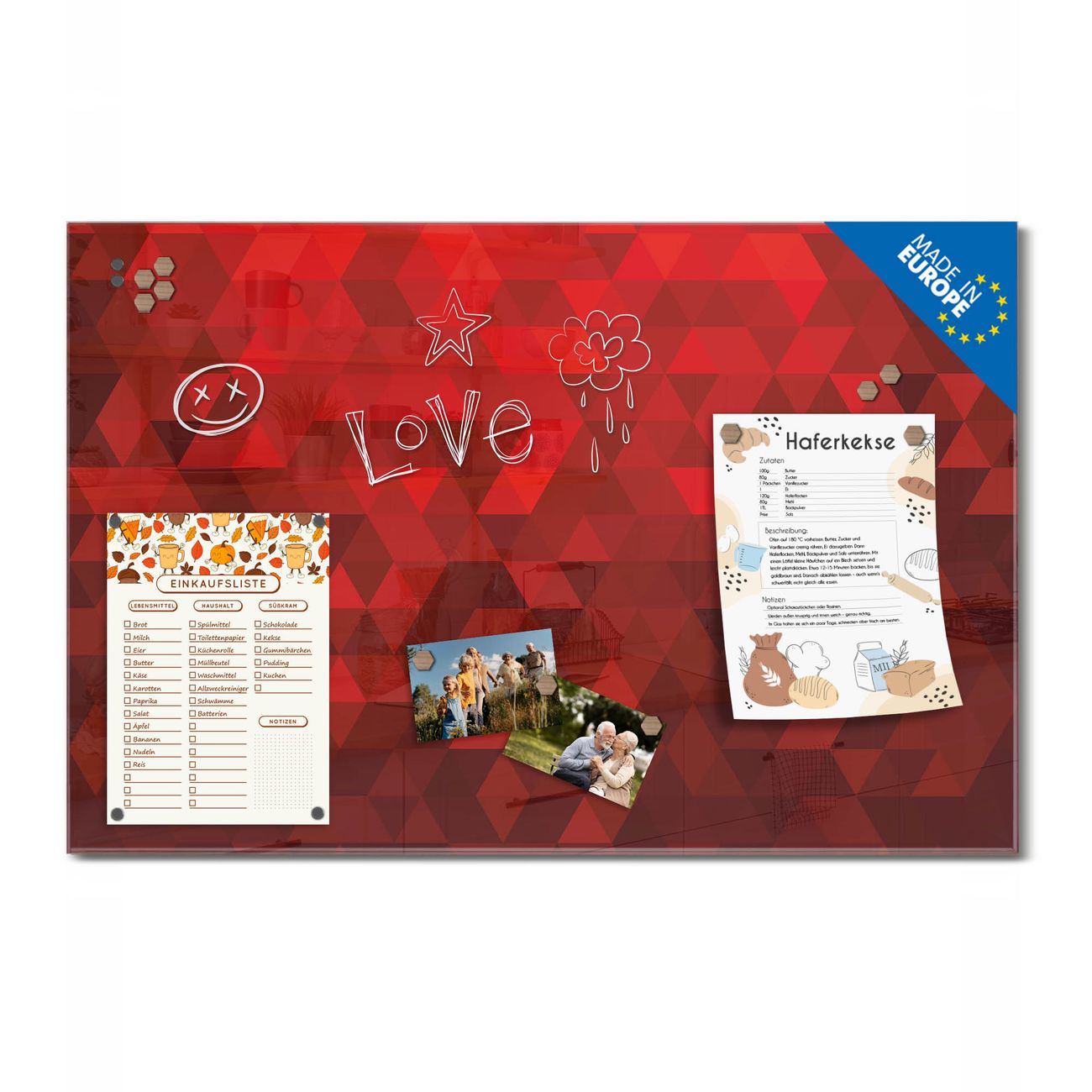 Ein Stück Design, das Ihren Alltag organisiert. Schreiben, heften, inspirieren - alles an einem Ort. Qualität, die man spürt. Montage leicht gemacht. Handwerk mit Herz - veredelt in Sachsen. Einzigartiges Design mit Motiv Motiv Dreiecke Rot Beschreibbare Glasoberfläche, leicht zu reinigen Starke Magnetkraft durch Stahlrückwand Inklusive 4 Neodym-Magneten Flexible Montageoptionen Handveredelt in Sachsen - Qualität, die bleibt